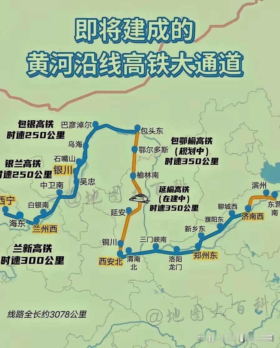神奇的黄河几字弯高铁通道即将建成,遗憾的是绕开了呼和浩特。 ①设计时速250/300公里的《银兰高铁》《兰新高铁》已经建成通车。 ②设计时速250公里的《包银高铁》年底前通车。 ③设计时速350公里的《包西高铁》榆林至西安段在建,包头至榆林段计划“十五五”期间建成通车。 ④设计时速350公里的《西安北至郑州东高铁》《郑州东至济南西高铁》已经建成通车。