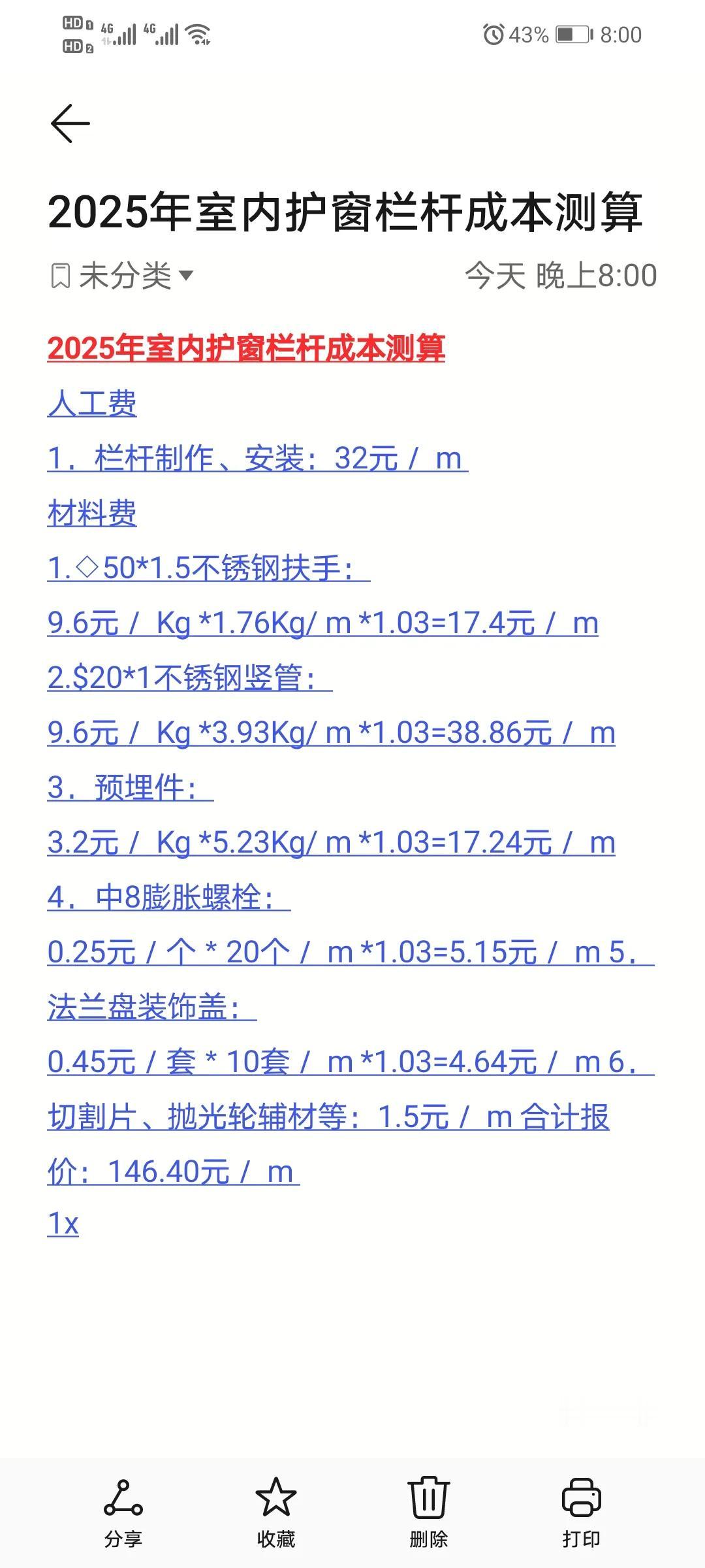 家人们,今天来给大家揭秘一下2025年室内护窗栏杆的成本到底是多少!你是不是以为这东西挺贵,或者挺便宜的?其实这里面的门道可多啦! 先来说说人工费,栏杆制作、安装每米要32元呢,这可是师傅们辛苦干活的钱,手艺费不能少。 再看看材料费,这可就更复杂啦。501.5的不锈钢扶手,每米得17.4元。201的不锈钢竖管,每米要38.86元。还有预埋件,每米得17.24元。中8膨胀螺栓每米5.15元,法兰盘装饰盖每米4.64元。就连切割片、抛光轮这些辅材,每米都得1.5元。 把这些费用都加起来,你猜怎么着?合计报价每米要146.40元。 我得说啊,室内护窗栏杆这价格,看似只是一些数字,但背后反映的是市场的供需和工艺的价值。大家在选护窗栏杆的时候,可别只看价格,更要看看材料和工艺。有些太便宜的,可能材料就不好,安全没保障。但也别觉得贵的就一定好,还是得咱自己心里有本账,算清楚成本,才能选到性价比高的产品,毕竟这是关乎家人安全的大事,可不能马虎!