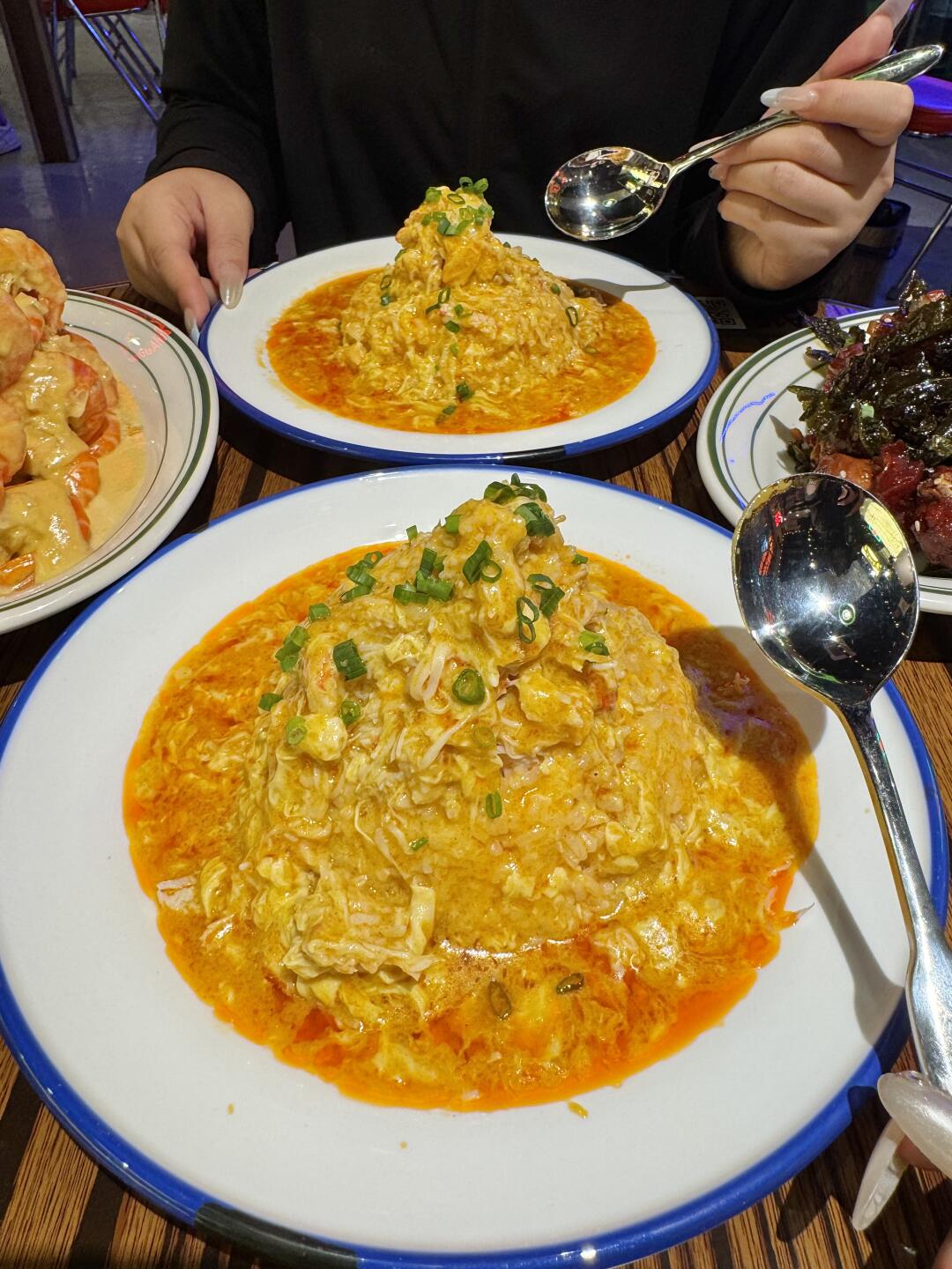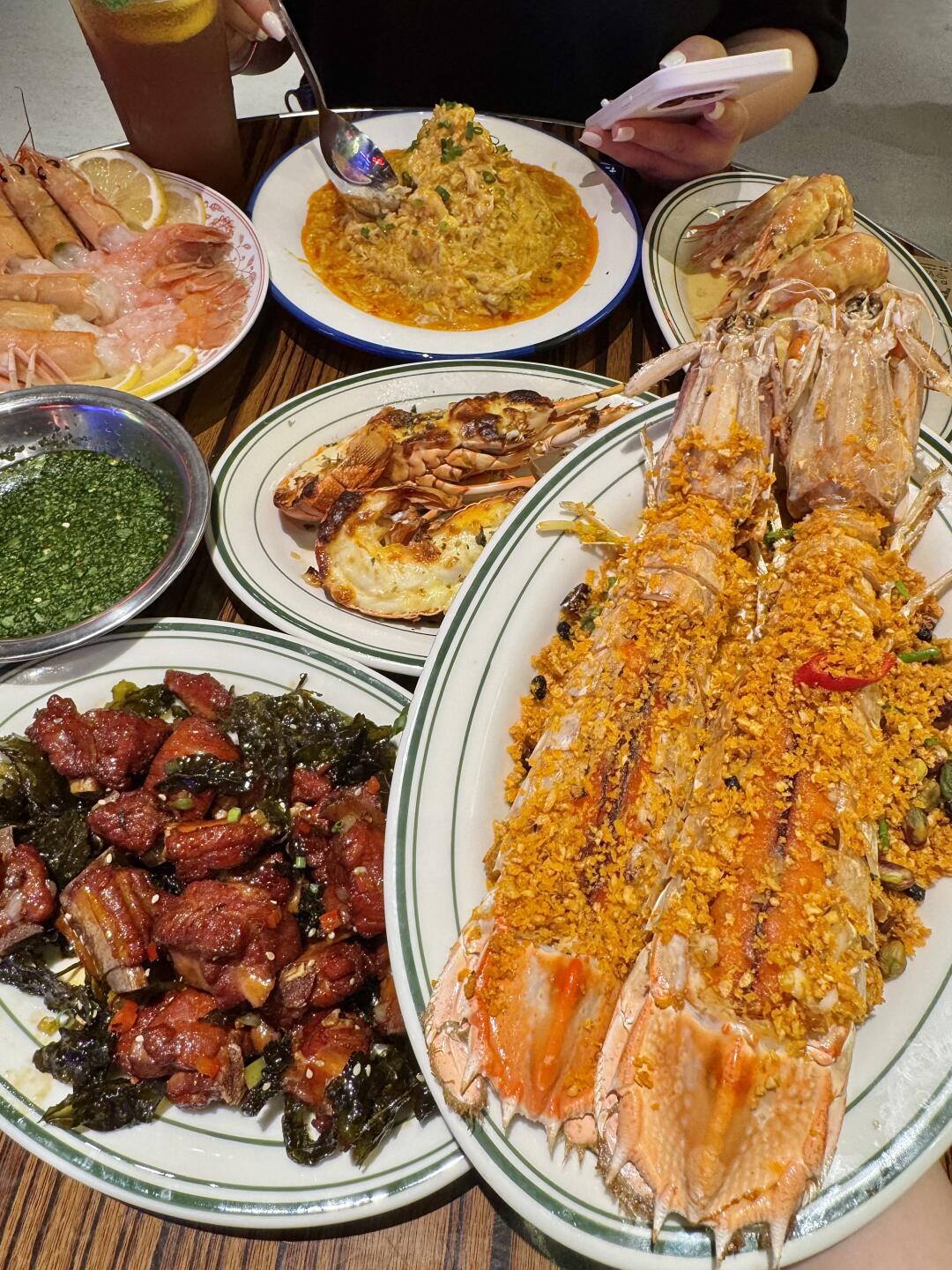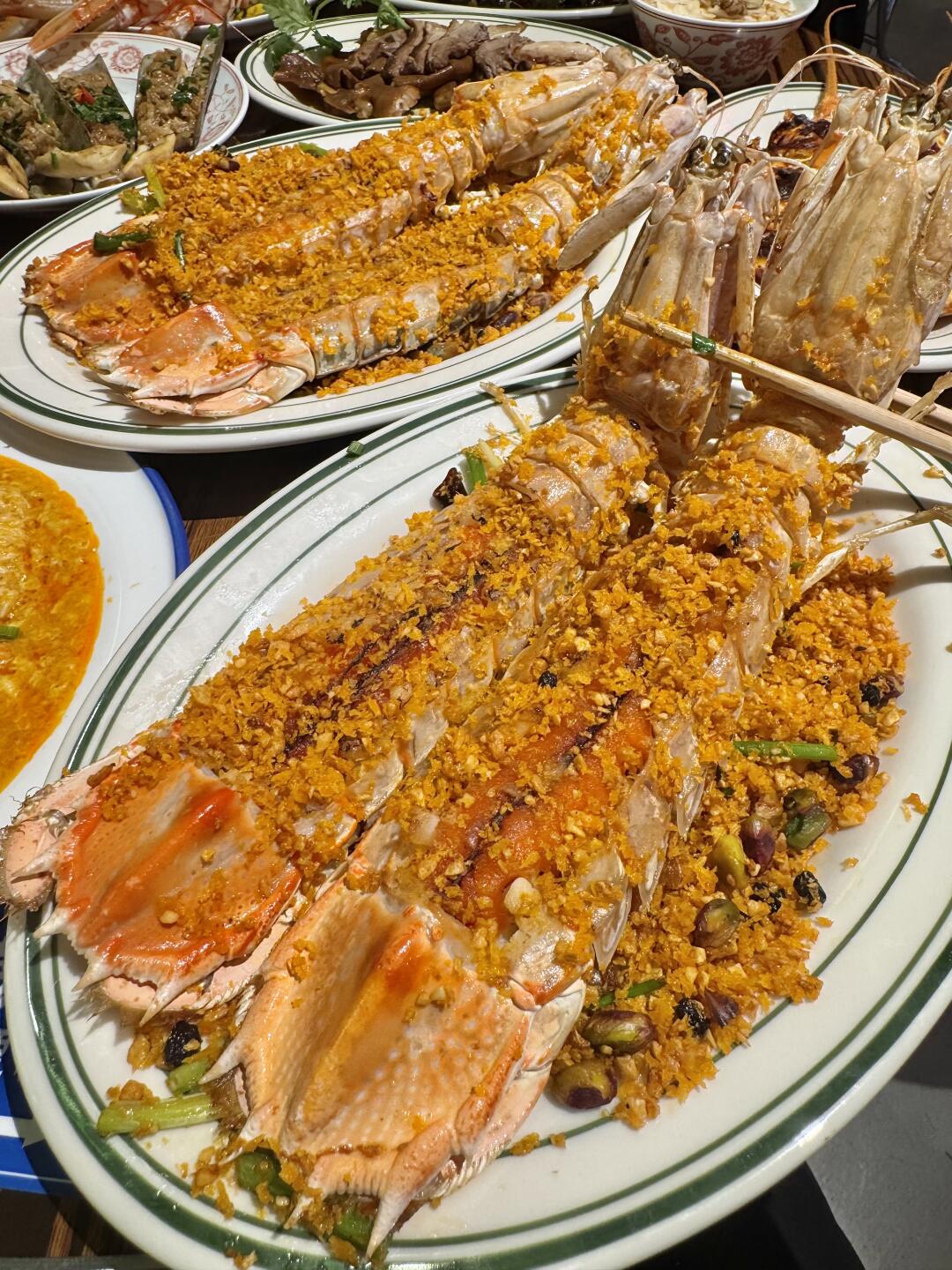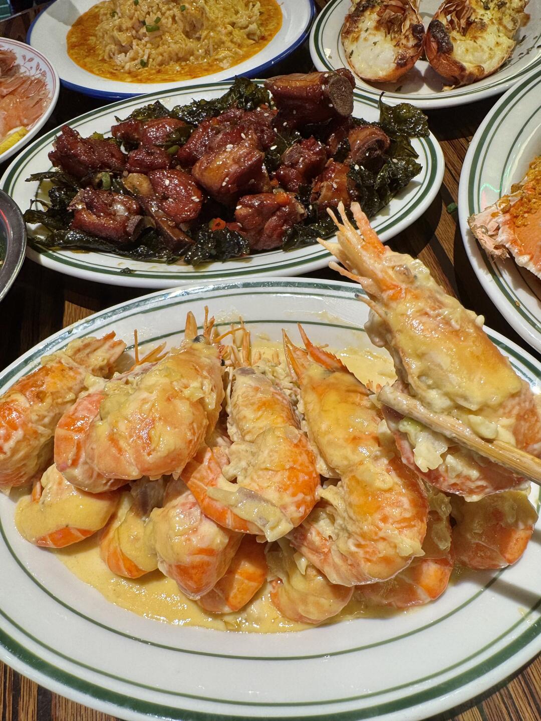 可以说近期吃到坠满意的一餐!! 茶香排骨!排骨加了茶叶一起炸,整个茶香四溢!好好吃 奶油罗氏虾、避风塘富贵虾、芝士奶油小青龙、生腌鳌虾……都很新鲜!!海鲜脑袋好满足😌 杭州