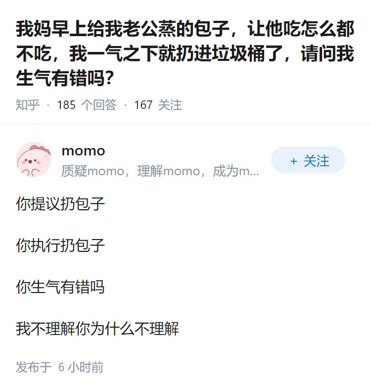 我妈早上给我老公蒸的包子,让他吃怎么都不吃,我一气之下就扔进垃圾桶了,请问我生气有错吗?