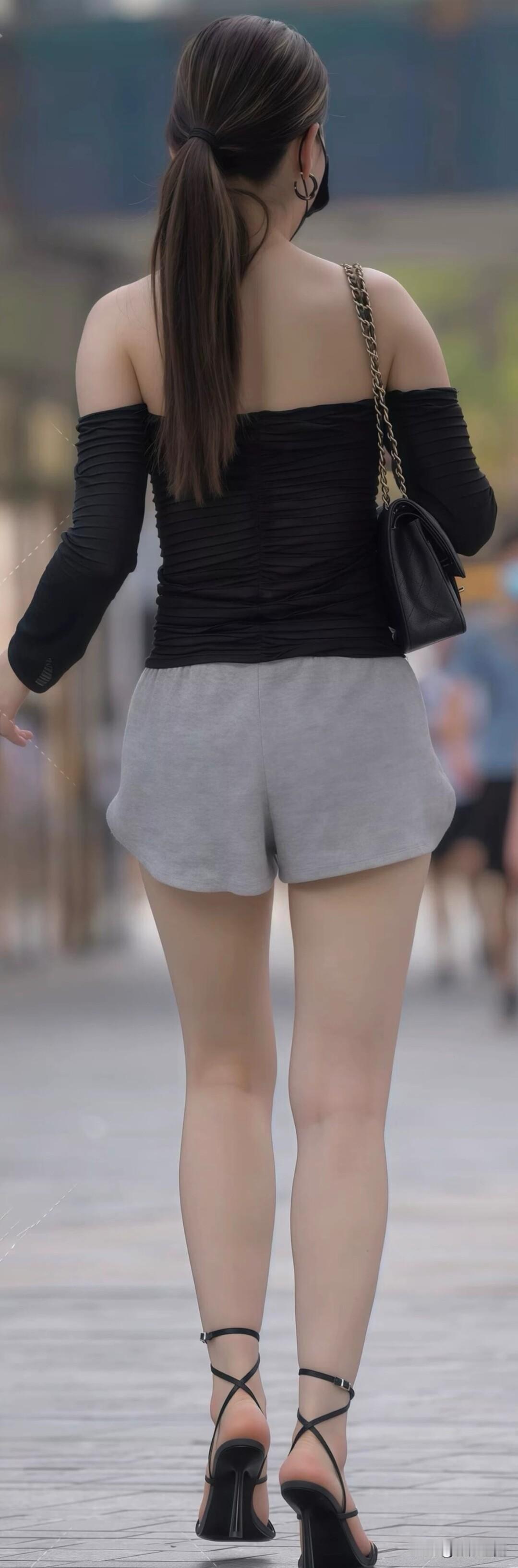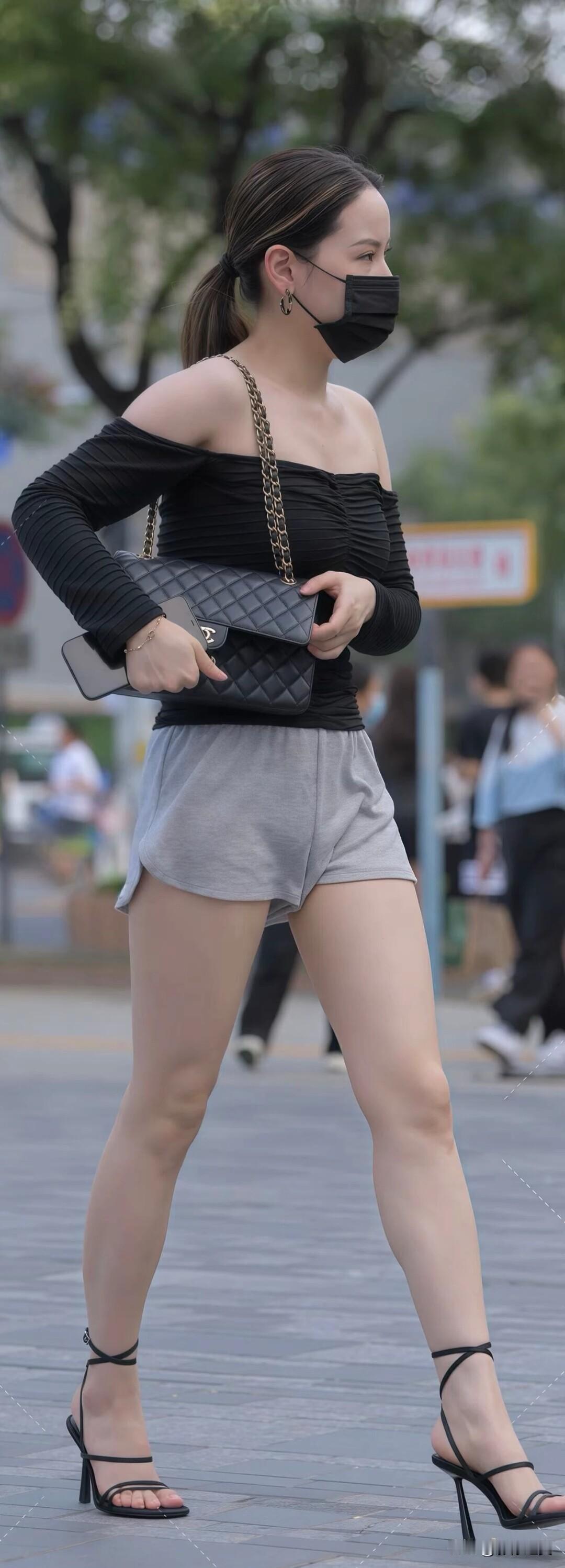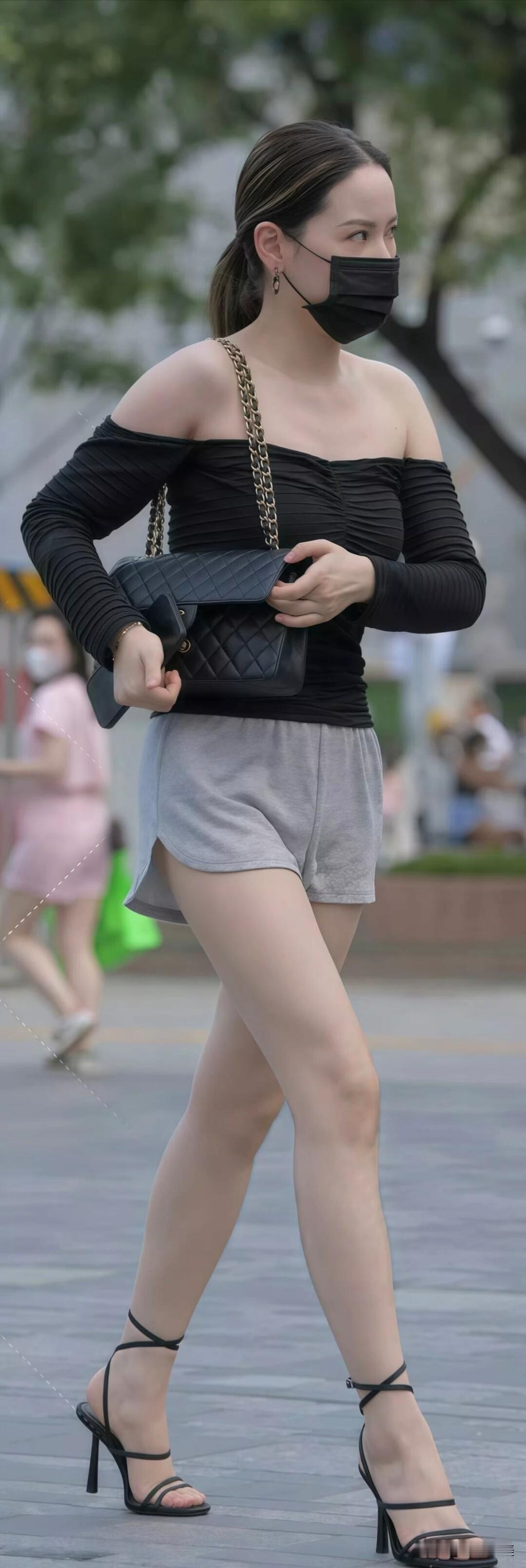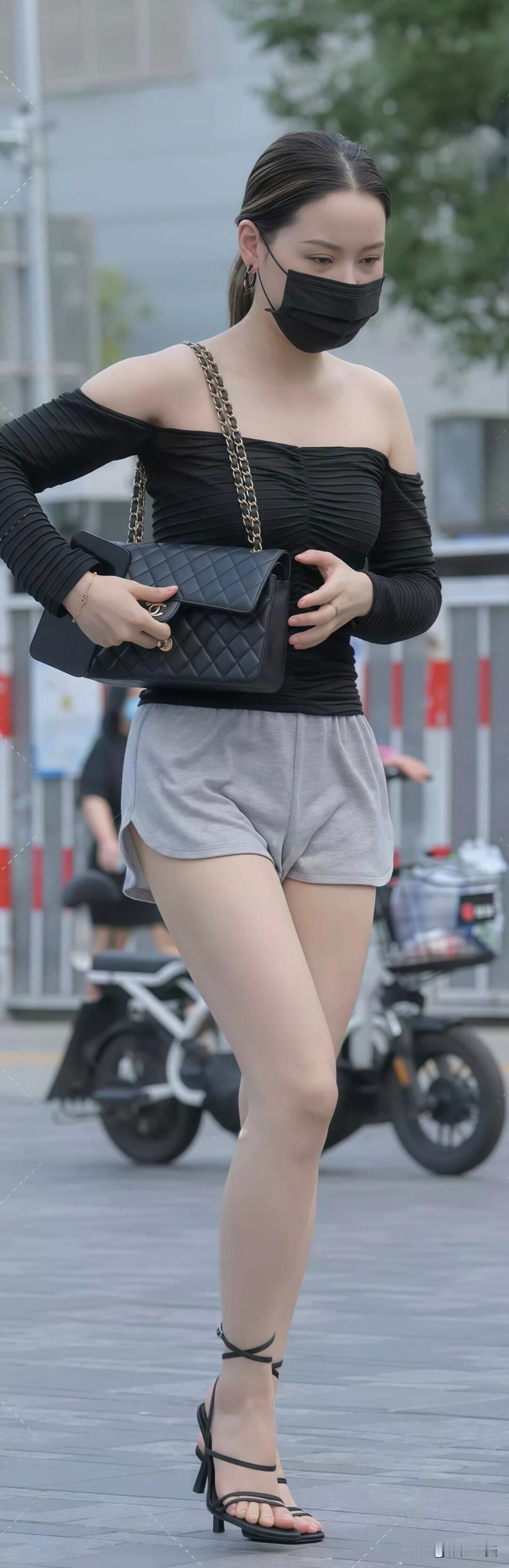 黑色一字肩上衣配灰色短裤,脚踩细带高跟凉鞋,再搭菱格链条包,优雅又随性,这穿搭太有格调了~