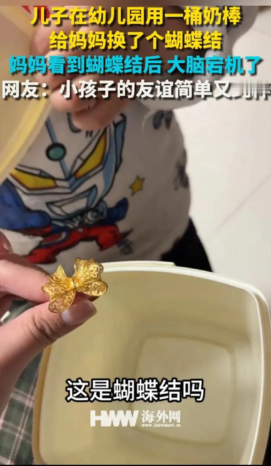 儿子在幼儿园用一桶奶棒给妈妈换了个蝴蝶结。妈妈惊讶是啥蝴蝶结,要一桶奶棒去换。儿子打开后,发现真是蝴蝶结,还是金的蝴蝶结戒指。 如果真的是足金的蝴蝶结戒指,这个价值5600多,一桶奶棒换,太值了!小孩子的友情真是简单又纯粹,几个奶棒就换个金戒指。情比金坚具象化,童真传递纯粹的感情。 当然如果是真的,这金蝴蝶肯定要还回去,这属于不当得利。家长肯定联系老师,寻找小孩,及时还回去了。 也提醒了各位家长,要看管好自己的贵重物品,以防小孩乱拿,小的会换,大的会卖。