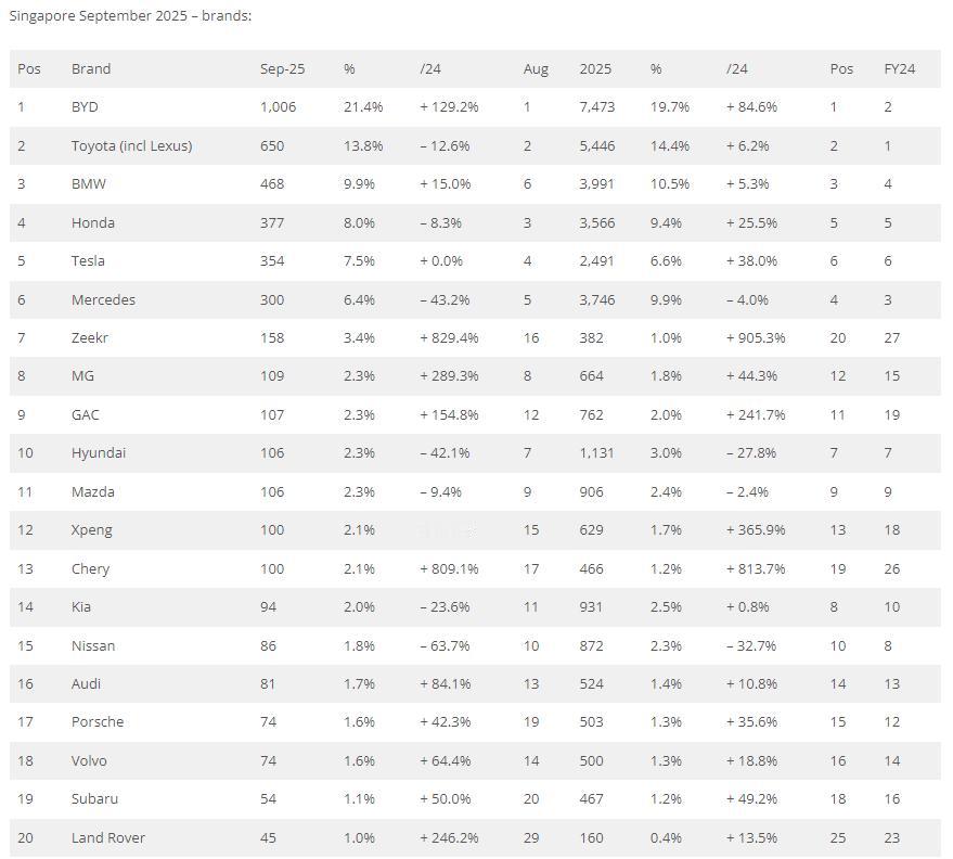 比亚迪在新加坡夺得九月销冠! 2025年9月,新加坡新车销量同比激增14%,至4,704辆。 2025年1-9月,新加坡累计销量同比增长24.1%,至37,937辆。 比亚迪高居第一,销量1006辆,终于破千,市占率21.4%创新高。 比亚迪在中国、乌拉圭、乌克兰、新加坡四个国家市场占据销量榜首。 中国品牌集体爆发:极氪(+829.4%)同比增幅超 8 倍,首次跻身新加坡品牌榜前十,份额 3.4%,成为本月市场最大黑马。名爵(+289.3%)、广汽(+154.8%)在前十剩余席位中同样实现超高增长。 比亚迪:1006辆,高居第一,市占率21.4%。 极氪:158辆,排名第七,市占率3.4%。 名爵:109辆,排名第八,市占率2.3%。 广汽:107辆,排名第九,市占率2.3%。 小鹏:100辆,市占率2.1%。 奇瑞:100辆,市占率2.1%。