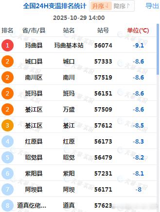 相反,今天西部地区有冷空气或降水发展,使得气温下降。甘肃玛曲降9.1℃、重庆城口降8.6℃、南川降8.6℃、万盛降8.6℃、青海班玛降8.6℃,为今天14时全国降温前五站点。