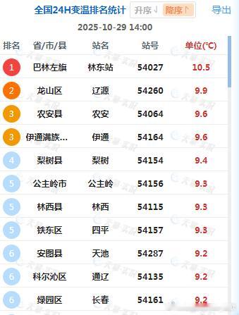 今天内蒙古东部和东北一带,有南风暖平流,导致升温。内蒙古巴林左旗升温10.5℃,为14时全国升温最强站点。今天浙江福建等地阴云减少,光照增多气温回升。