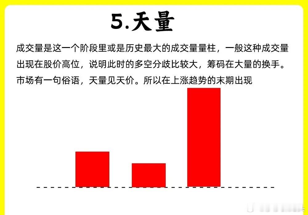 当天的成交量是这一个阶段里或是历史最大的成交量量柱,一般这种成交量出现在股价高位,说明此时的多空分歧比较大,筹码在大量的换手。市场有一句俗语,天量见天价。所以在上涨趋势的末期出现,就要谨慎