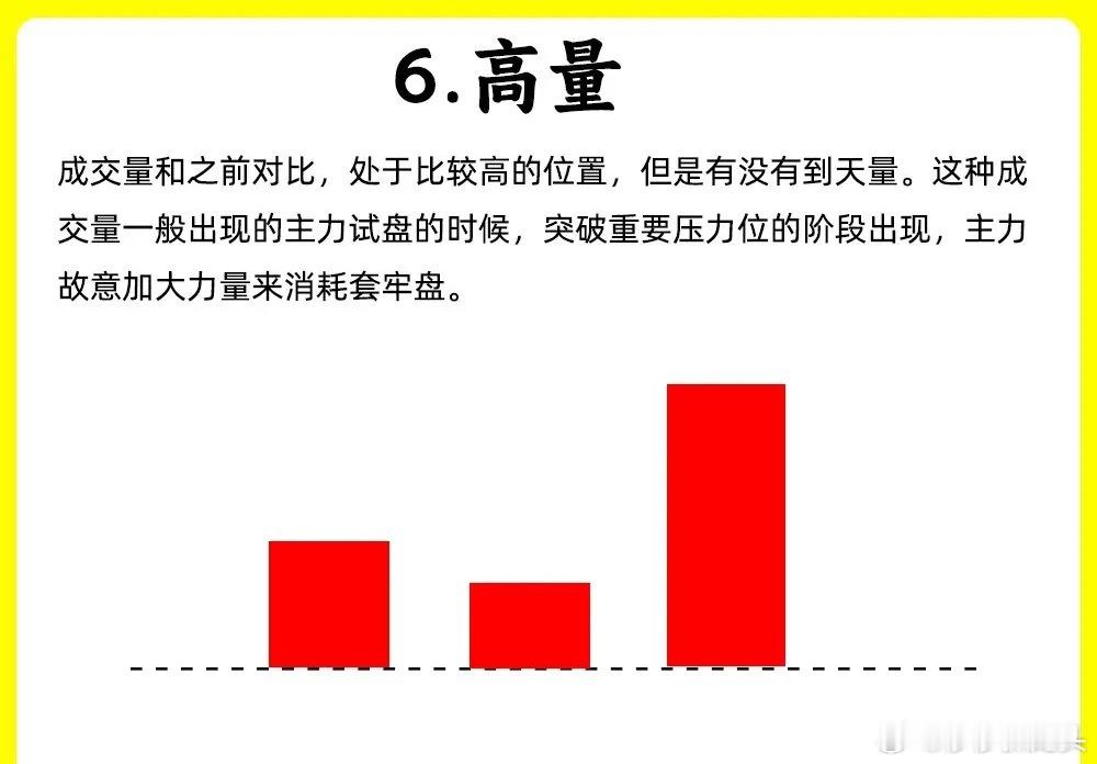 当天的成交量和之前对比,处于比较高的位置,但是有没有到天量。这种成交量一般出现的主力试盘的时候,突破重要压力位的阶段出现,主力故意加大力量来消耗套牢盘。高量说明此时交易活跃度很高,像我们常见的形态就高量不破,放量过左峰等等。