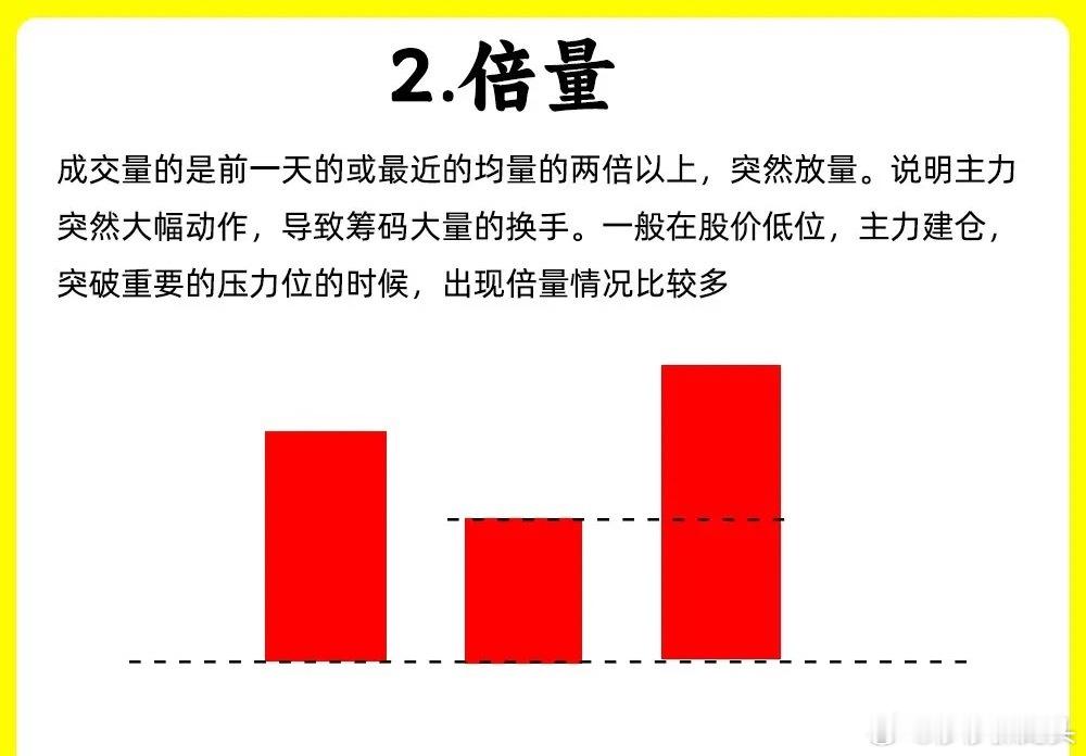 倍量是不可否认的主力行为,就是当天的成交量的是前一天的或最近的均量的两倍以上,突然放量。说明主力突然大幅动作,导致筹码大量的换手。一般在股价低位,主力建仓,突破重要的压力位的时候,出现倍量情况比较多。