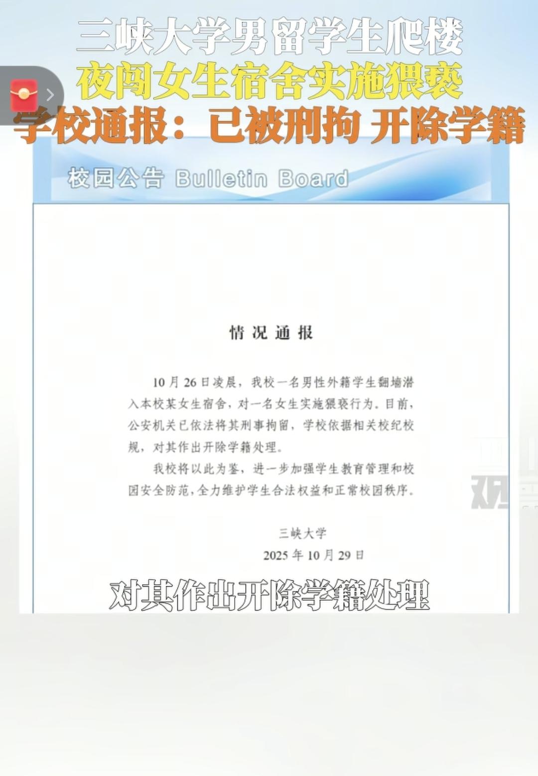 某高校外籍留学生,翻墙进去的女生宿舍,这说明什么?说明 学校的安防措施不到位 而且两个宿舍位置太近了 为什么要把男留学生宿舍位置和南苑女生宿舍位置安排的那么近? 再者这男留学生在学校都这么肆意妄为了吗?谁给的特权和胆子! 现在院方给二楼的女生宿舍加了防盗网,那如果遇到身手敏捷的,爬上三楼了怎么办? 我想还得从源头解决,这事必须从重处罚,而不是简单的开除学籍,必须严惩不贷!让这些留学生明白自己没有什么特殊的,以后所有的留学生都不能搞特殊,进来留学最好是查清祖上3代,身世清白,人品好的才能来! 千万不要再给这些留学生一些错觉,让他认为自己特殊,就算犯事被抓了,也不会多大点事?顶多就是被学校批评教育! 要让他们明白在中国犯了法,就跟国人犯法一样的,没有特殊,刑拘完了以后再遣送回去,原则不能乱! 你们说对吗?