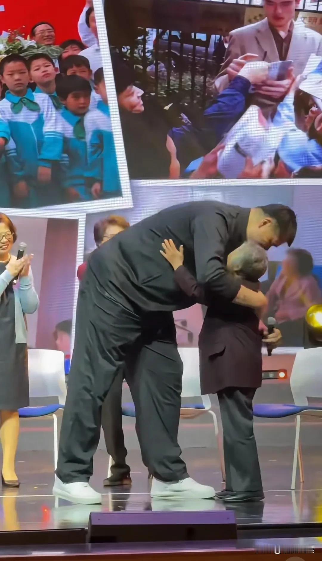 姚明从美国返回上海,现身小学母校,参加母校七十周年校庆。 2米多高的姚明,和小小瘦瘦的小学班主任再次相遇,这身高反差感太绝了! 白发苍苍的老师见到自己的学生事业有成,一脸的骄傲,姚明见到自己印象最深的老师,一脸的尊敬,他不仅和老师握了手,还弯下腰来抱了抱老师! 看姚明的言谈,他还记得二十多年前老师的名字,还记得他们的样子和有趣的事情,也感谢母校对他的培养,感觉他情商好高啊! 在电视上看到姚明在篮球队打球的样子就是觉得他高,但是看到他在现实中站在人群中的样子,真的有种“巨人误入小人国”的感觉!