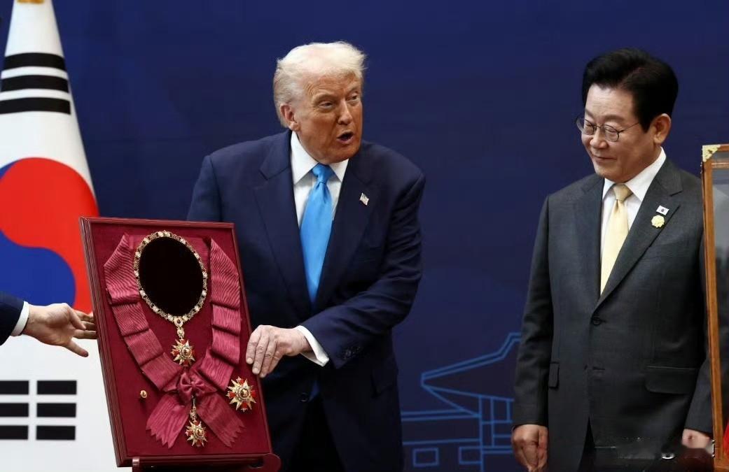 2025年10月29日,韩国总统李在明向到访的美国总统特朗普赠送了一顶以新罗王朝金冠为原型的黄金模型,并授予其韩国最高国家勋章“无穷花大勋章” 。 据报道,在正式欢迎仪式上,李在明向特朗普授予了“无穷花大勋章”,以表彰他在朝鲜半岛扮演的“和平缔造者”的角色,特朗普是首位获得该勋章的美国总统 。同时,李在明还赠送了一顶新罗王朝出土的“天马冢金冠”的复制品给特朗普,该王冠据信曾被新罗王室和高级别官员佩戴,象征着天命与王权的结合,以及领袖的强大领导力和权威 。 为了取悦特朗普,韩国可以说是费尽心机。在特朗普稍早前飞抵釜山后,韩方在接机时,专门请乐队演奏特朗普的“专属跳舞歌曲”《Y.M.C.A.》。 特朗普与李在明的工作午餐包括一道“黄金甜点”,这也是在迎合特朗普的喜好。