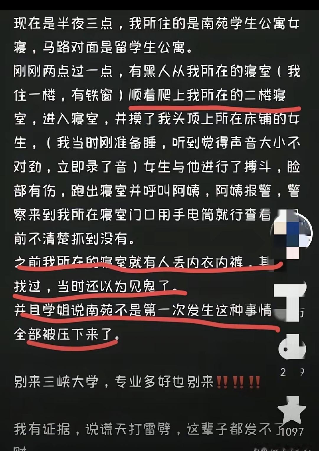 南苑女生宿舍有人发声“上铺女生与混进来的黑子博斗了,脸上带伤,跑出去找的宿管阿姨,这事惊动了这栋楼的人”,当时阿姨想都没想就给孩子们报了警,通知了学校保安,而且之前就出现过内衣内裤突然不见了的情况! 奉劝所有人填报志愿时尽量避免这种地方,因为上头有人把他们当坐上宾,有风吹草动都压下去了,学生们有苦难言,想毕业就得闭嘴!