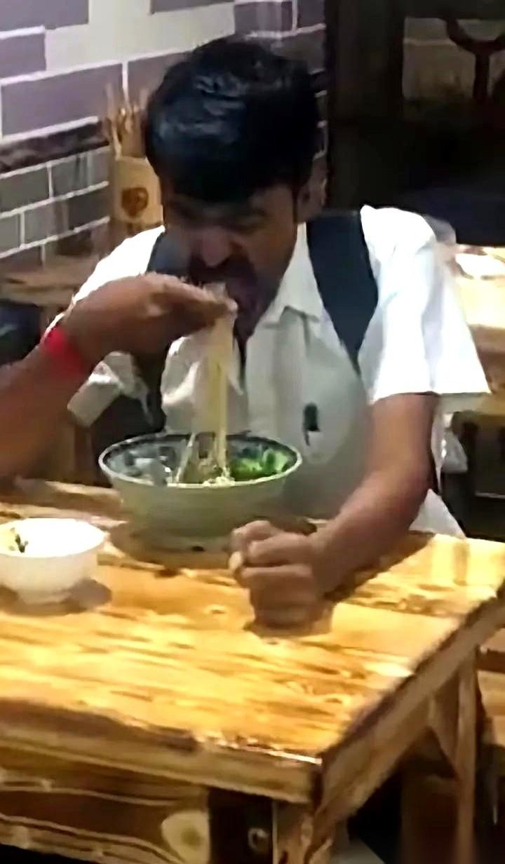 哥们儿,面刚出锅,滚烫滚烫的,他就直接下手了。 一家面馆里,一个印度朋友。 筷子