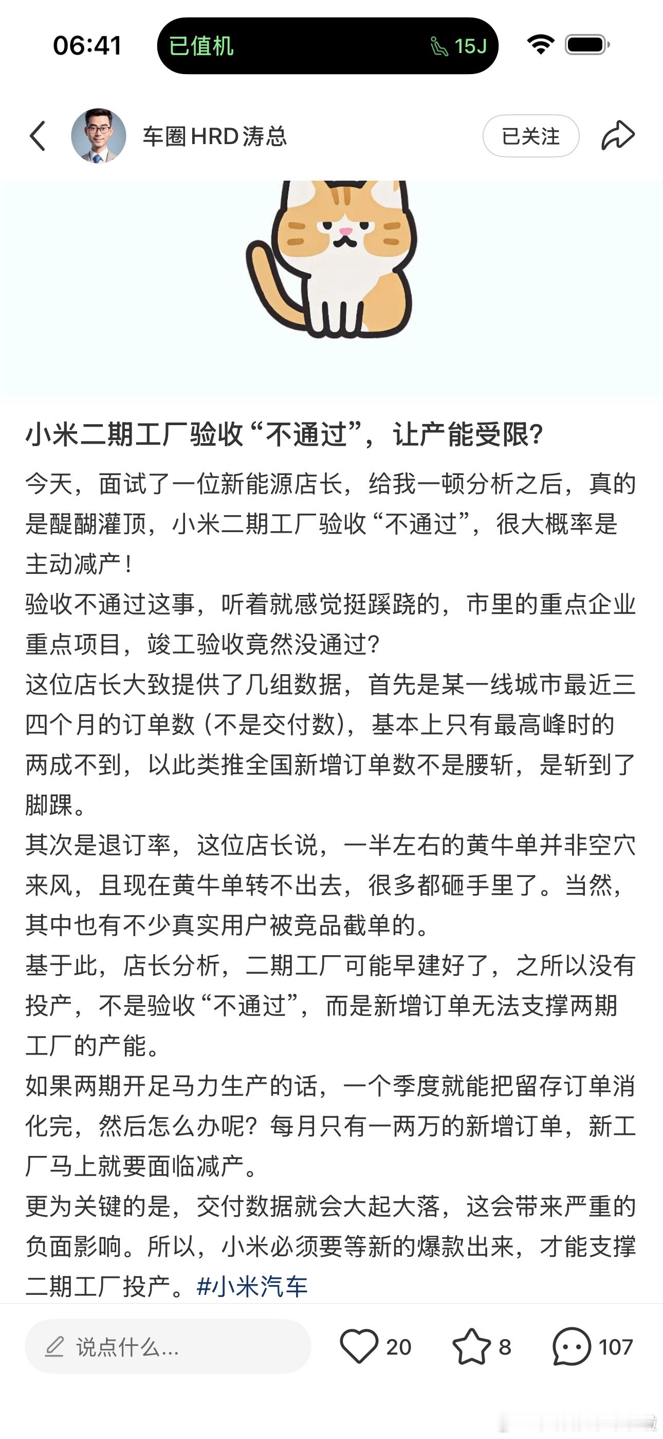 传闻小米汽车 二期工厂已经建好,但验收“没通过”分析人士称:这是主动“减少”上马产能,因为“期车”订单增长乏力,看来雨田君口中的“脑残粉”,智商已经开始占领高地了[打call][笑cry][笑cry]小米汽车[超话]小米汽车工厂年接待量超10万人小米汽车销量小米汽车转单市场遇冷