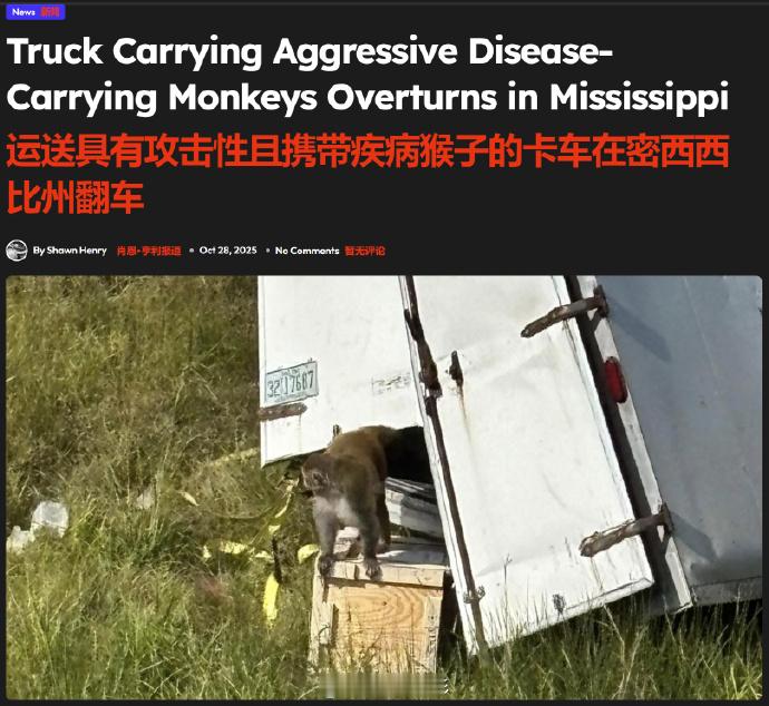 【不止1只!美国警方证实:仍有3只实验猴在逃,或携带多种疾病】疑似携带病毒的猴子在美国逃脱 10月30日消息,据美联社等多家美国媒体报道,当地时间10月28日,美国密西西比州59号州际公路发生一起事故,一辆运输猴子的卡车在行驶中侧翻,导致部分猴子逃脱。