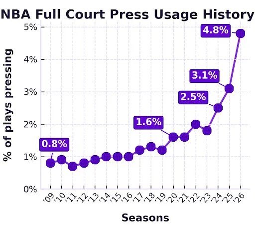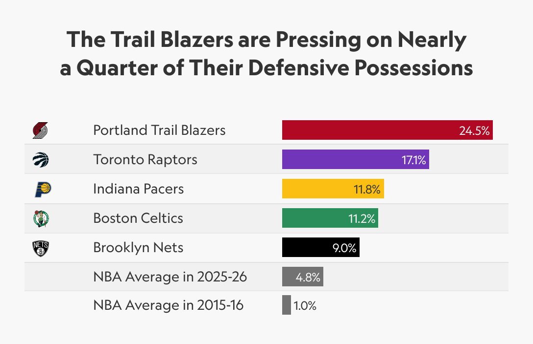 截至本场之前,开拓者接近四分之一的回合都采用全场领防压迫,他们也是造失误断层第一+场均抢断第一。过去三个赛季,NBA全场领防压迫的防守方式连续增多。