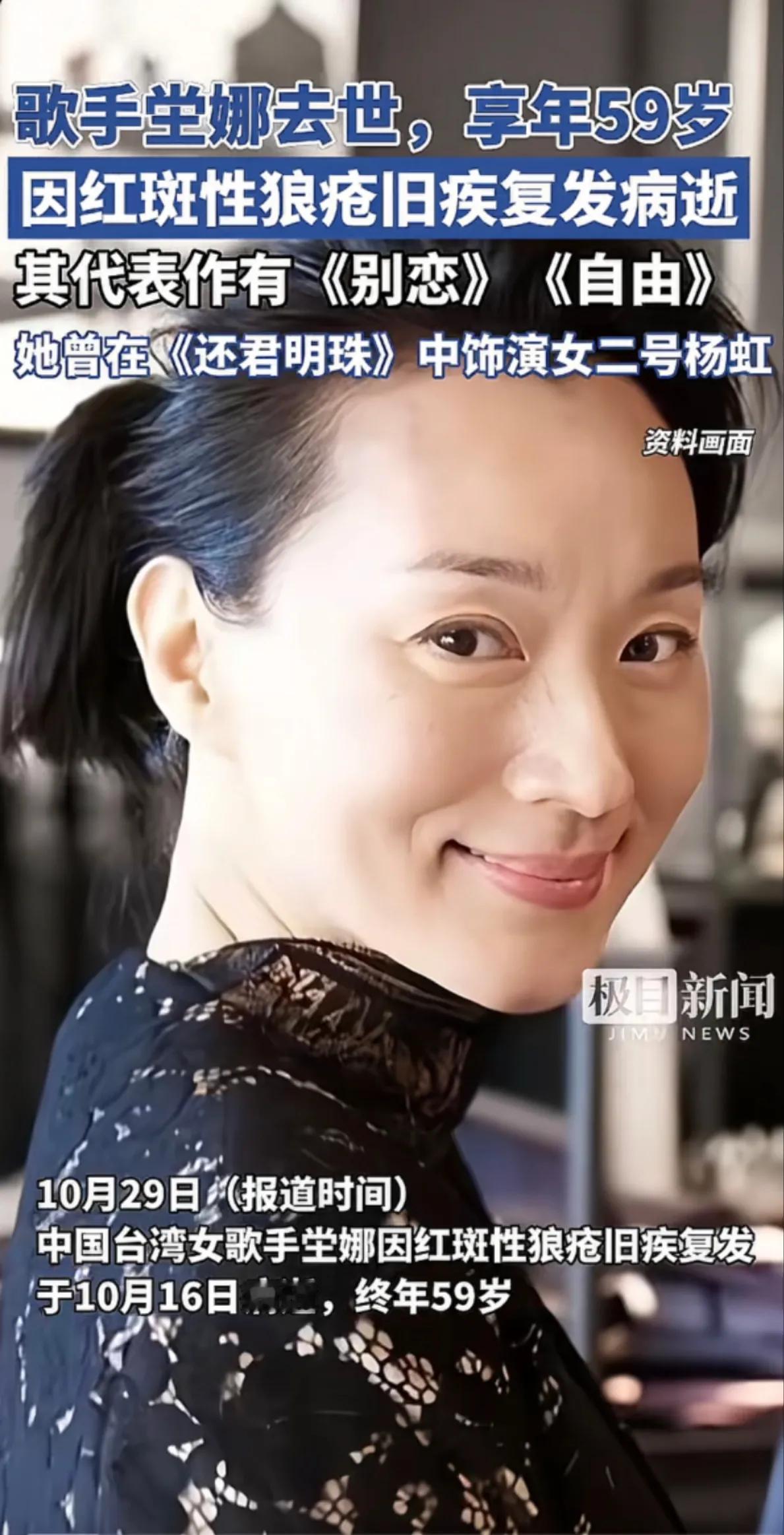台媒传来悲痛消息,台湾知名歌手坣娜因红斑狼疮旧疾复发,于2025年10月16日在台北家中永远地离开了我们,享年59岁 ,她的好友张光斗发文证实了这一令人心碎的消息。 坣娜,本名蔡宜桦,1986年踏入演艺圈,此后在影视歌三个领域都取得了不俗的成绩,展现出了卓越的艺术才华。她发行的《奢求》《别恋》《自由》等歌曲,凭借独特的嗓音和深情的演绎,给听众留下了极为深刻的印象。在电视剧《还君明珠》中,她饰演的女二号杨虹,个性鲜明,被她诠释得入木三分,精湛的演技获得了观众的一致认可。她还曾两次获得金曲奖国语歌后提名,“美声天后”的称号实至名归。 然而,命运却对坣娜格外残酷。她早年就被确诊患有红斑性狼疮,随着年龄的增长,身体机能逐渐下降,再加上遭遇车祸后免疫系统受损严重,红斑狼疮病情频繁复发。雪上加霜的是,在2022年左右,她又被查出罹患癌症 。双重病痛的折磨让她不堪重负,最终不得不退出演艺圈。但即便在与病魔顽强抗争的日子里,她也从未放弃对生活的热爱,她的坚强令人动容。如今,她的离去让无数粉丝悲痛万分,她的音容笑貌和那些经典作品,将永远留在大家的记忆中。红斑狼疮 蔡宜桦