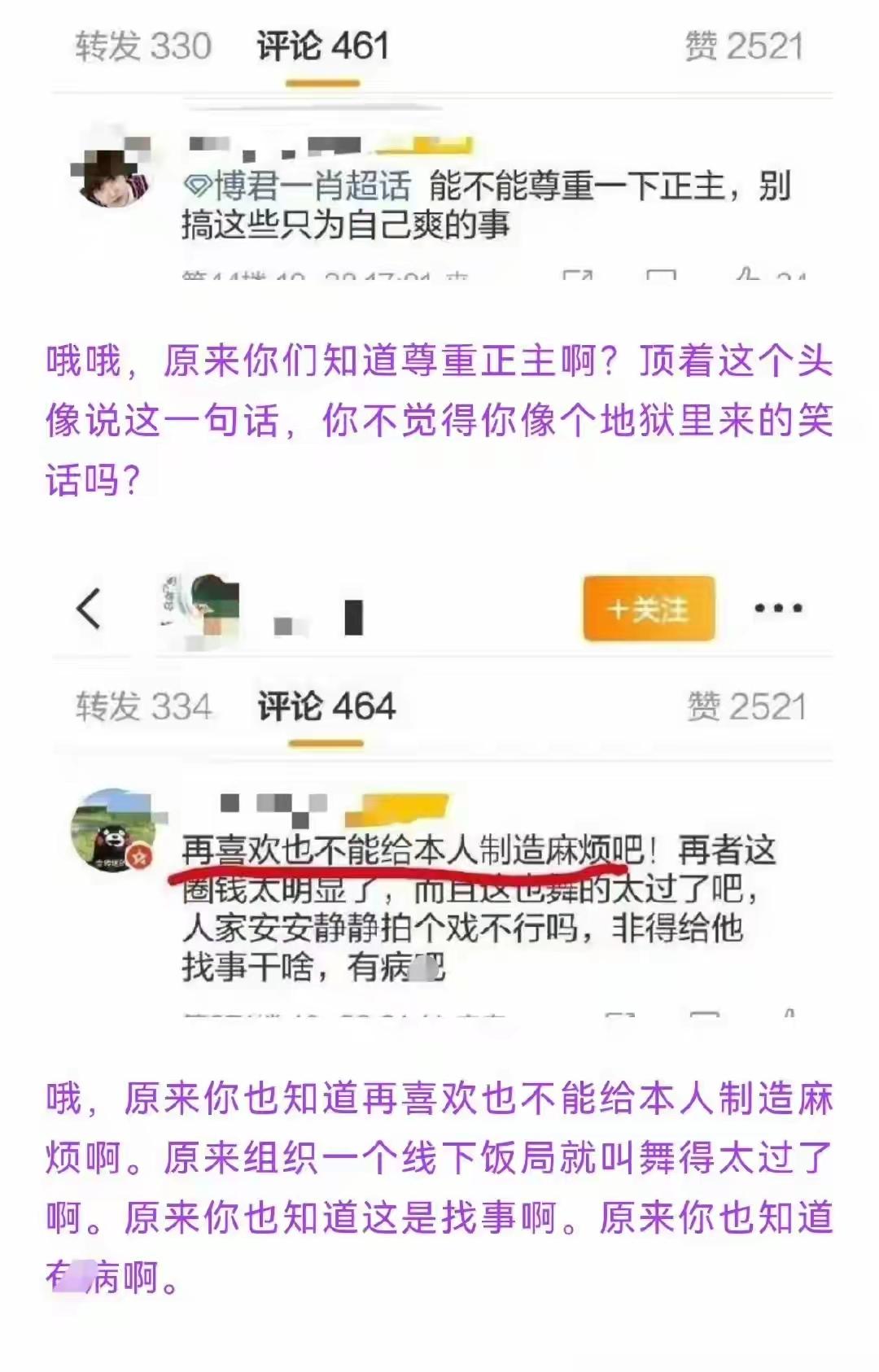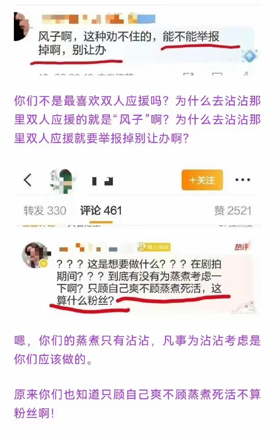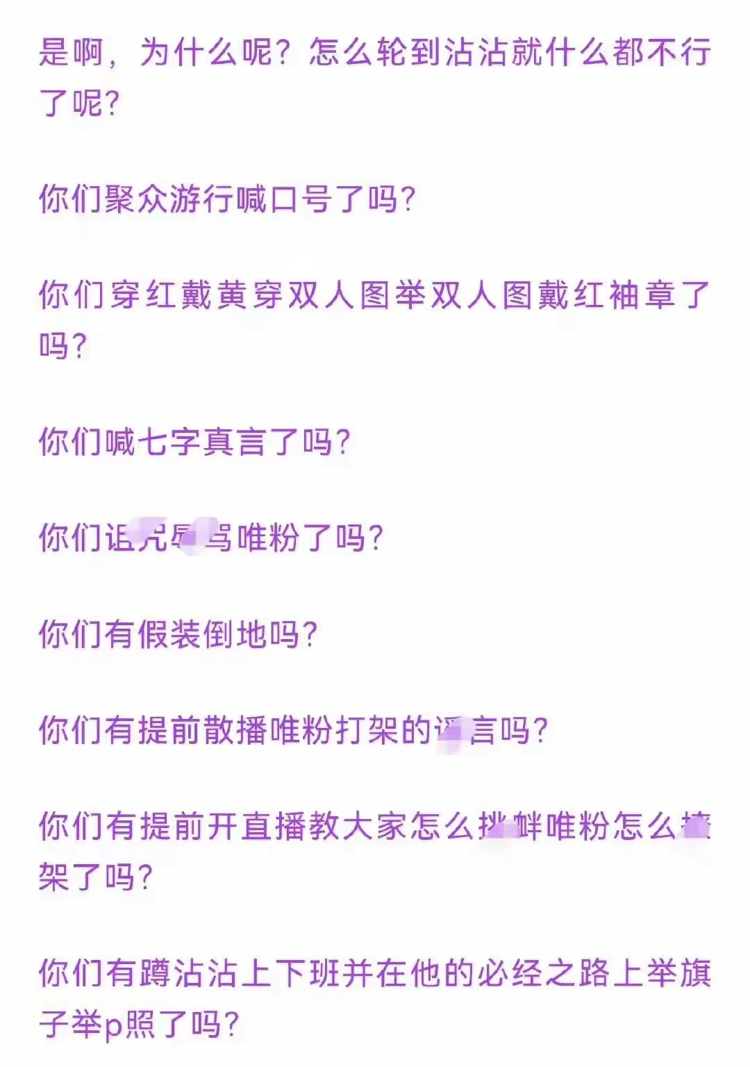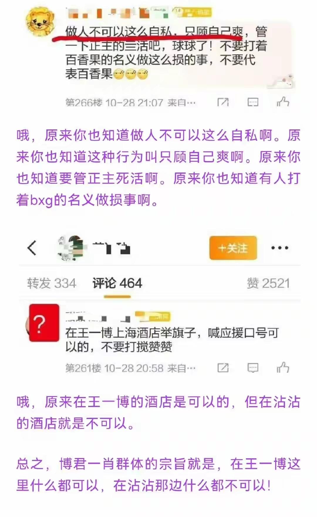 原来她们知道,双人应援舞男男txl是违背公序良俗的,是不好的影响啊!!! 她们说,几十个人在酒店自嗨吃饭对肖战有不好的影响;但是全球直播的正规体育赛事上她们举着鬼图、p的男男结婚照闹事甚至都被警察驱逐的时候就不怕双人应援给王一博带来恶劣影响? 她们说,酒店是私人场合不应该双人应援更不应该拿p的结婚照舞到蒸煮面前。但是去正式体育赛事时wyb入住的酒店地下停车场举双人p图就不是私人场合了? 她们说,喜欢就别把他架在火上烤,喜欢是尊重,那么她们有一丝一毫尊重过王一博吗? 所以,当所谓的cpf从来只维护一方利益却只仇恨和损害另一方的时候,这就是赤裸裸的一方唯粉啊,哪里来的cpf? 肖战亲口、公开认领的博君一肖cpf,就是肖战粉丝,不要再嫁祸给别人了。