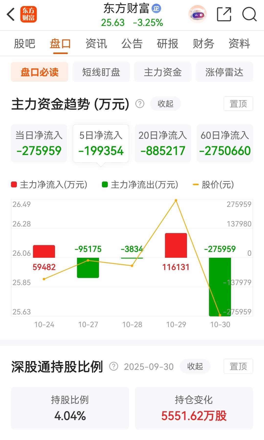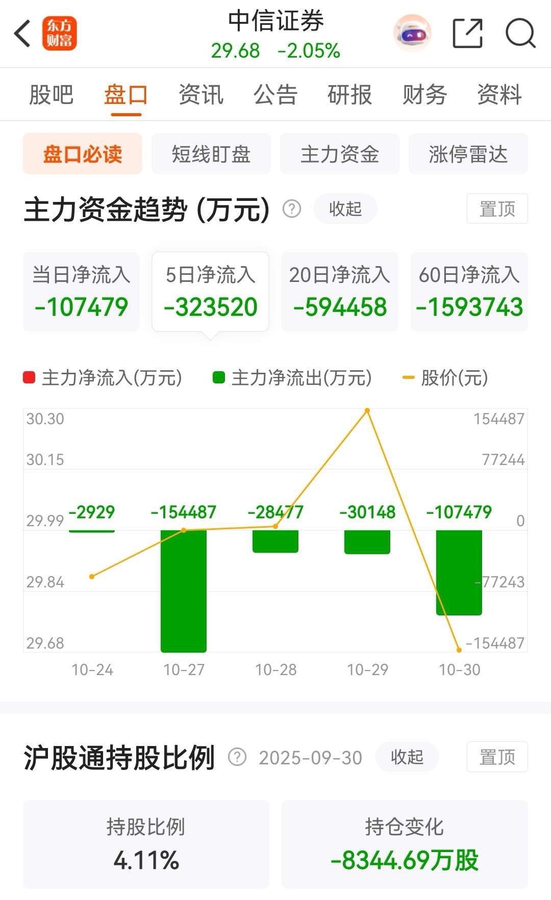 东方财富和中信证券,今天均是低开低走,分别下跌了3.25%、2.05%,且均被主力资金大幅净卖出,而中信证券更是连续五天被主力抛售了!东方财富今天低开后一路走低,几乎就是以最低价收盘,跌幅为3.25%,报价为25.63元,全天的成交金额为121.30亿元。在资金流向上,今天被主力资金大幅净卖出了约27.5959亿元,近5个交易日则是合计净卖出了19.9354亿元。从走势上看,今天收出的这根中阴线,完全吞没了昨日的小阳线,且跌破了各条均线,再次回到到了原来的横盘整理平台内。