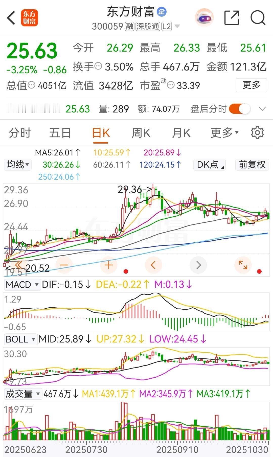 东方财富和中信证券,今天均是低开低走,分别下跌了3.25%、2.05%,且均被主