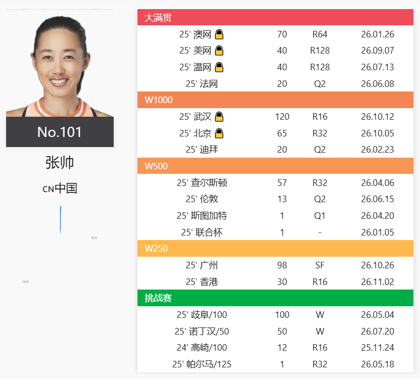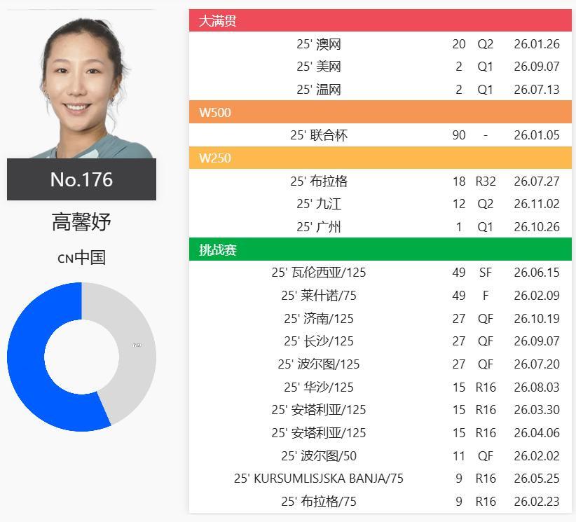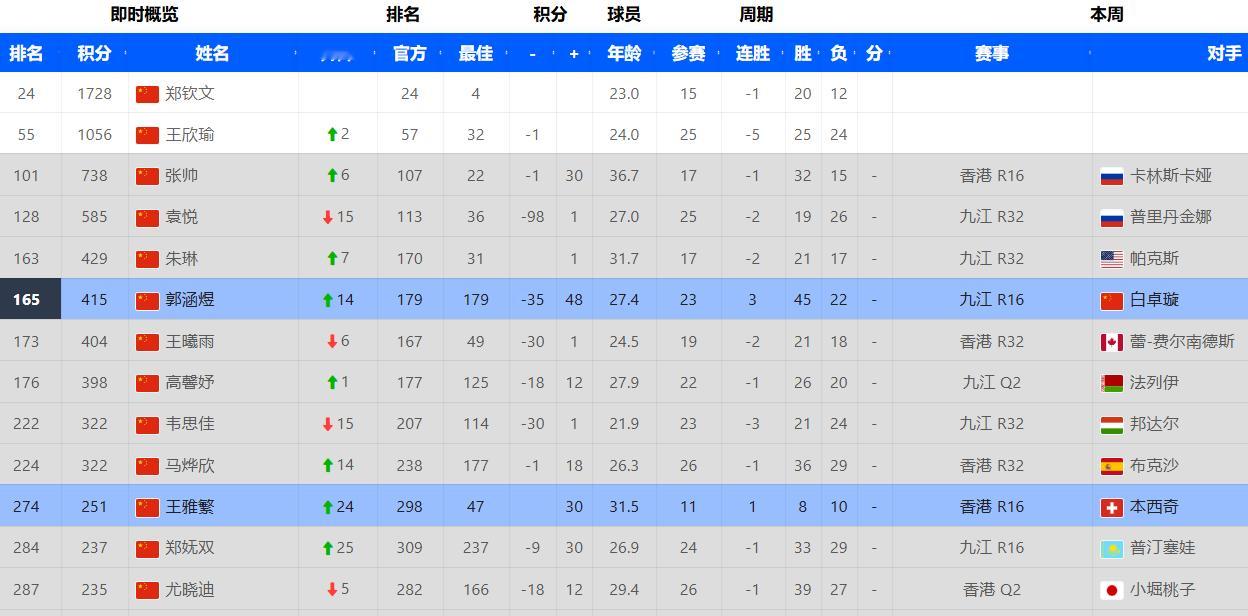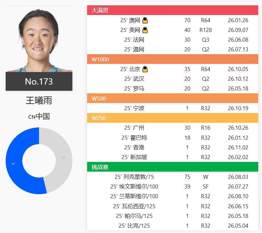 7.王曦雨,即时排名173。11胜14负(参加6站挑战赛)。