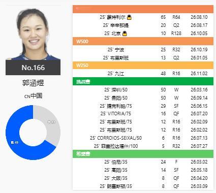 6.郭涵煜,即时排名166。31胜19负(参加8站挑战赛,4站希望赛),代表成绩:深圳 贵阳两站挑战赛冠军,取得2场WTA正赛胜利。
