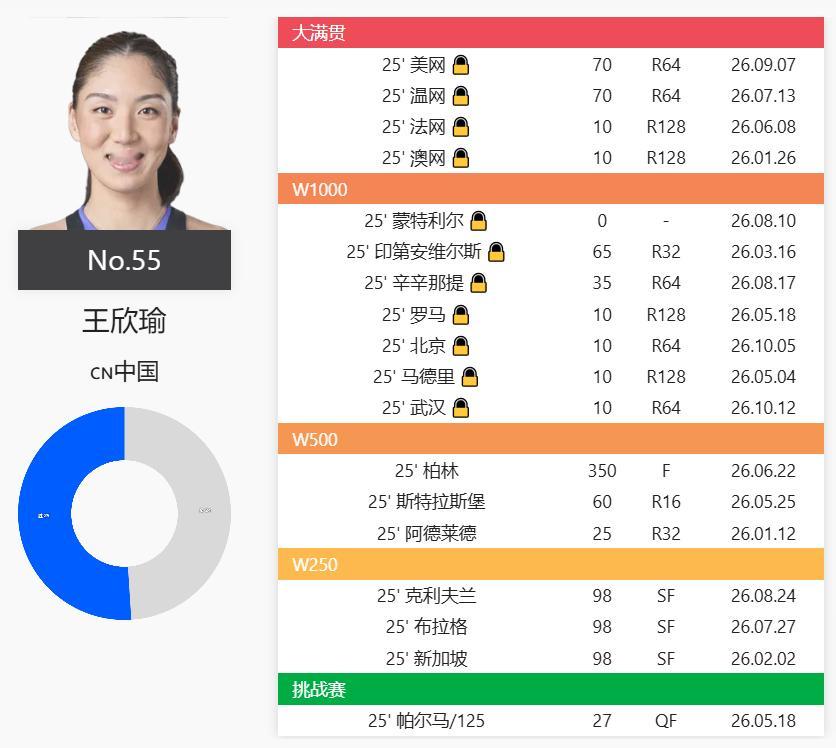 2.王欣瑜,即时排名57。21胜24负(参加1站挑战赛),代表成绩:柏林亚军(负万卓索娃),草地灵光一闪!