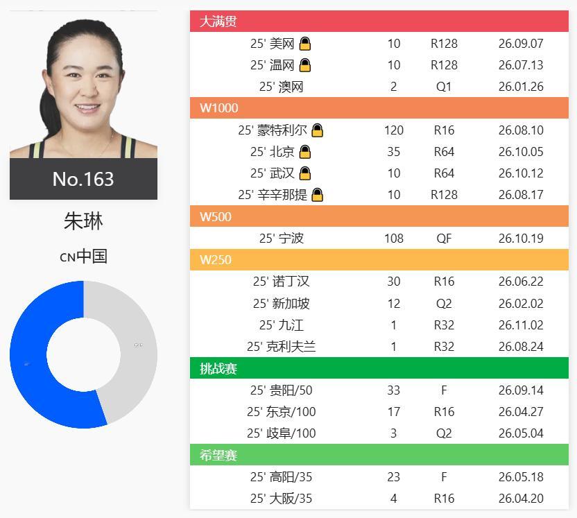 5.朱琳,即时排名163。17胜14负(参加3站挑战赛,2站希望赛),代表成绩宁波8强,蒙特利尔16强。