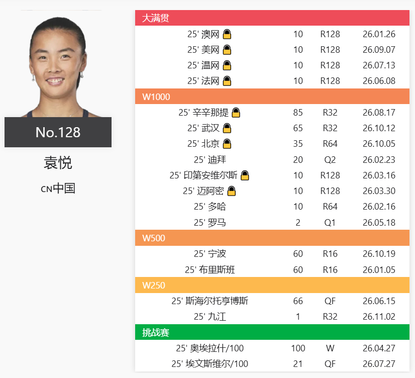 4.袁悦,即时排名128。16胜21负(参加2站挑战赛),代表成绩:辛辛那提32强,宁波、布里斯班16强,奥埃拉什挑战赛冠军。