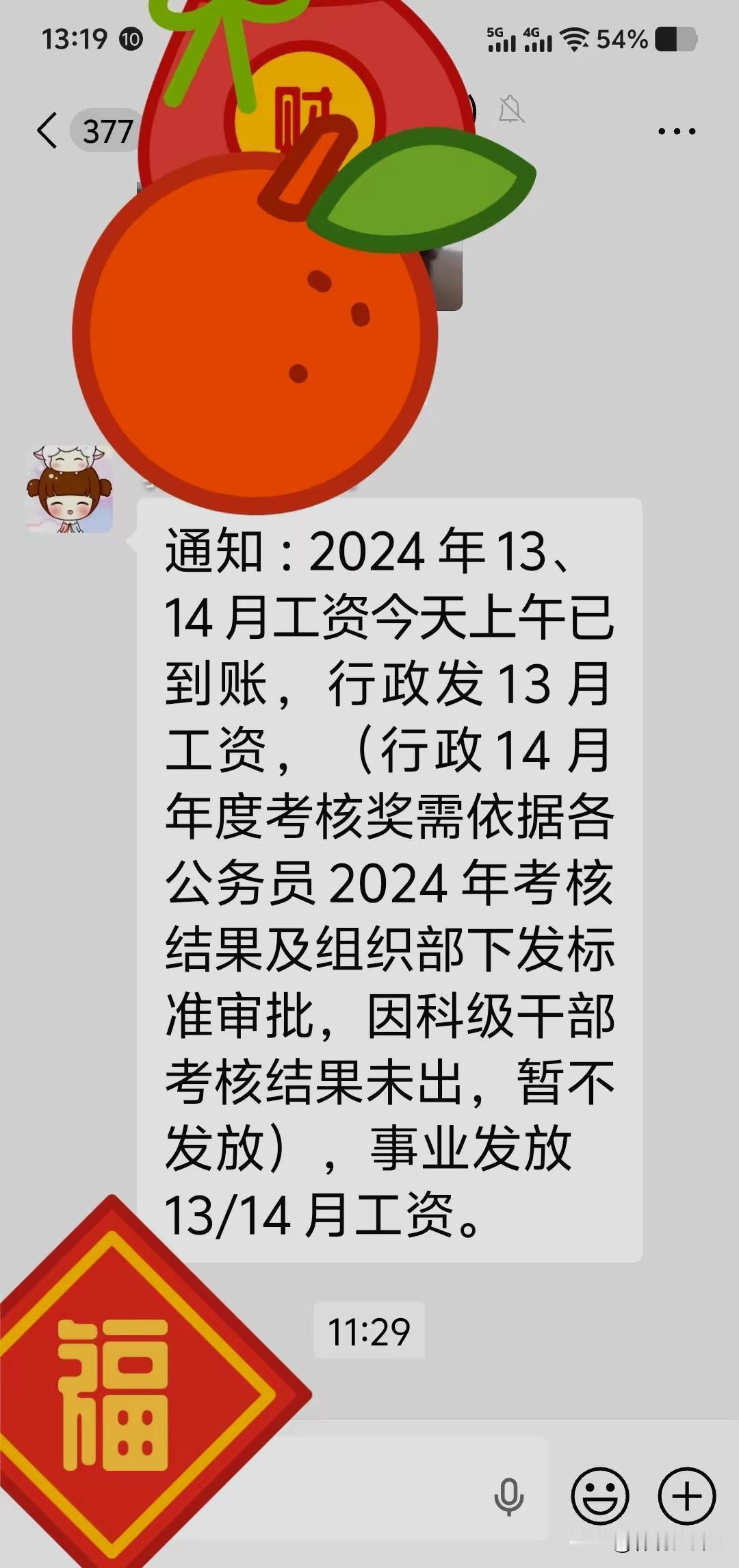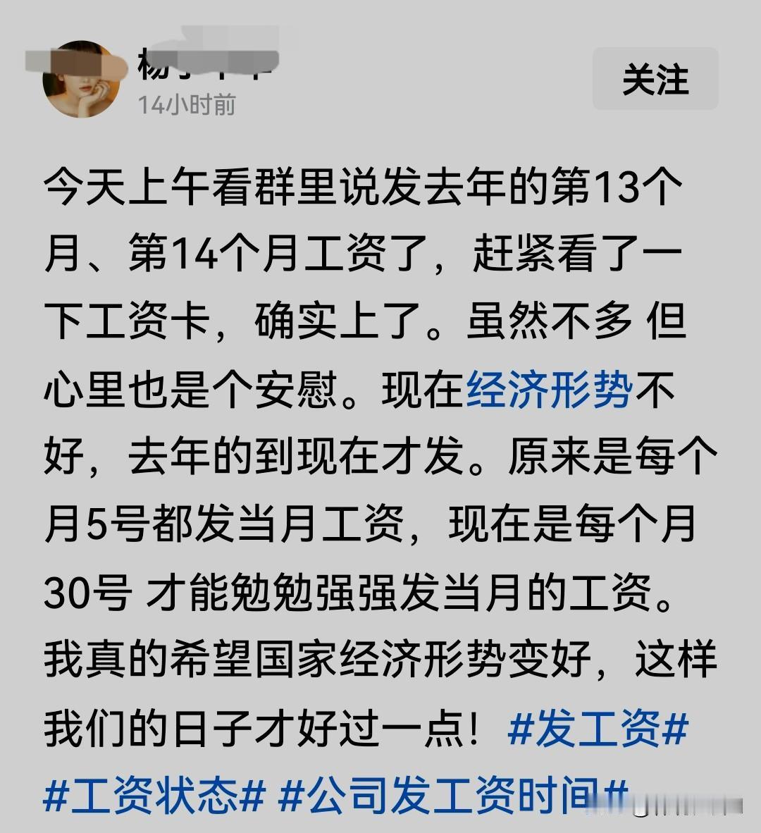 10月31日凌晨,在网上浏览到一位IP地址为新疆的网友发的一篇微头条,其大概内容如下:30日上午,看群里说发2024年的第13个月、第14个月工资了,赶紧看了一下工资卡,确实发了。可能是作者为了证明没有虚言,该微头条还配发了两张图片。 一张图片为群聊中的通知:2024年13、14月工资今天上午已到账,行政发13月工资,(行政14月年度考核奖需依据各公务员2024年考核结果及组织部下发标准审批,因科级干部考核结果未出,暂不发放),事业发放13个月、14个月工资。 另一张图片为河南农商银行发来的账户变动提醒截图,截图显示的交易时间:2025年10月30日10时45分;交易类型:代发入账;交易金额:10166元。 从该网友配发的图片看,其已经发放了2024年第13个月和14个月工资应该基本属实。不过,让人感到疑虑的是:这位IP地址在新疆的网友,为什么谈论的工资发放事情发生在河南?如果这位网友表述的是她自己的工资发放情况,那么,她是在新疆出差?还是在新疆休假?我们不得而知。 在这里想提醒一下收入比较稳定的网友:如今社会各行各业比较卷,能有一个稳定的工作并且能按时发放工资,这已经让很多人羡慕了。别人一年发12个月的工资都困难,你们一年发14个月的工资还抱怨,是否有点不知足了?所以,建议这些网友:还是低调一点点,既不要在网上抱怨,也不要在网上炫。至于去年应该发放的13个月、14个月工资,即便今年10底才发,也仅仅是晚发了一段时间。