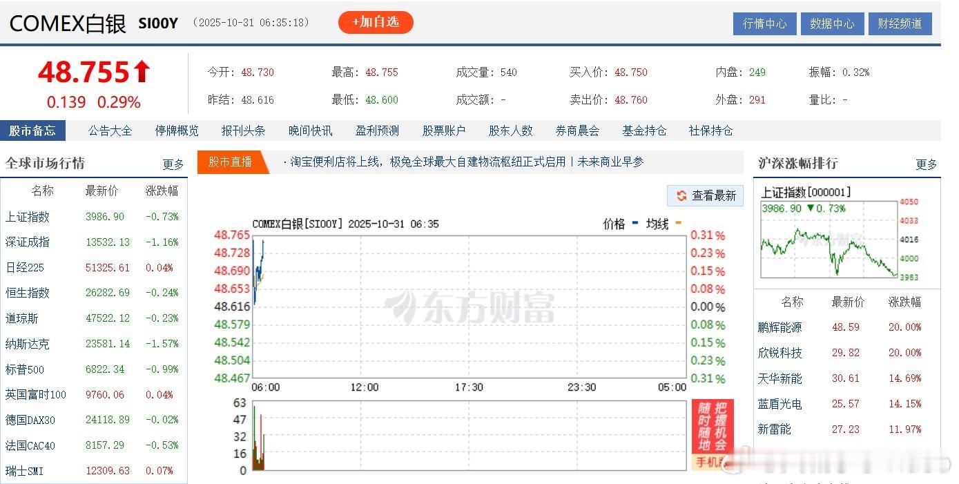 【金价银价转涨】美东时间10月30日,现货黄金涨2.41%,报4024.46美元/盎司;COMEX黄金期货涨0.94%,报4038.30美元/盎司;COMEX白银期货涨1.71%,报48.73美元/盎司。(每经)