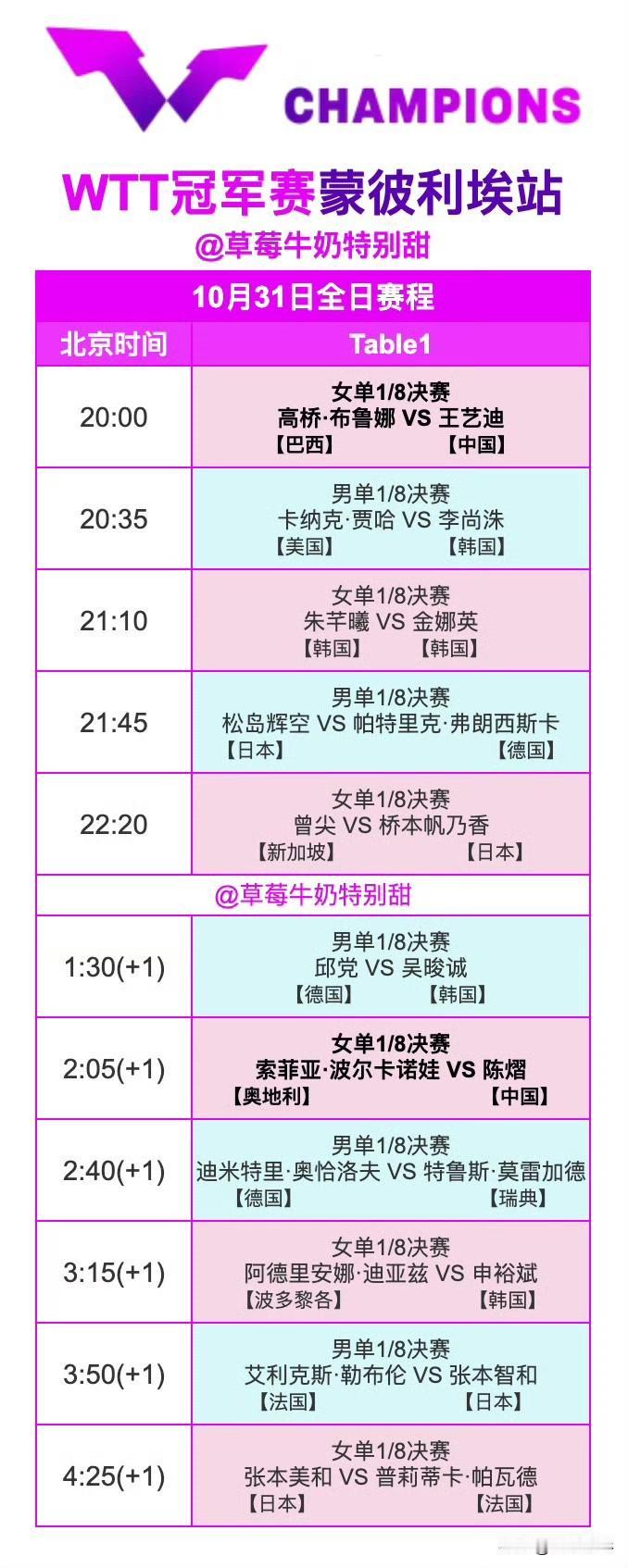 10月31日全日赛程P2 国乒赛程如下: 20:00 T1 王艺迪🇨🇳VS高桥·布鲁娜🇧🇷 2:05(+1) T1 陈熠🇨🇳VS索菲亚·波尔卡诺娃🇦🇹