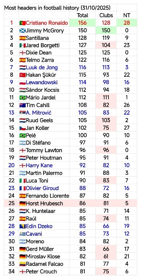 🔺贾德尔112粒头球可以排在足坛历史第十(与柯奇士并列)