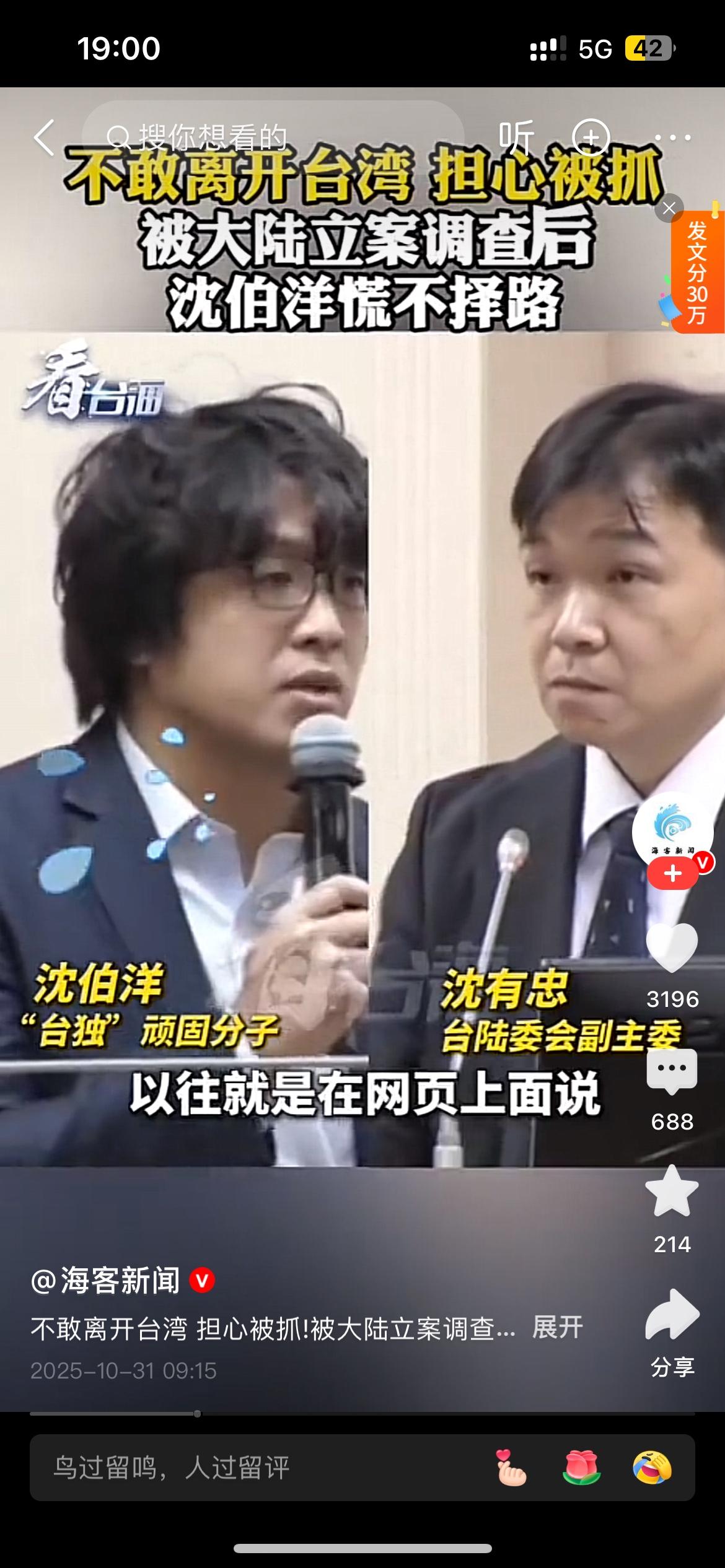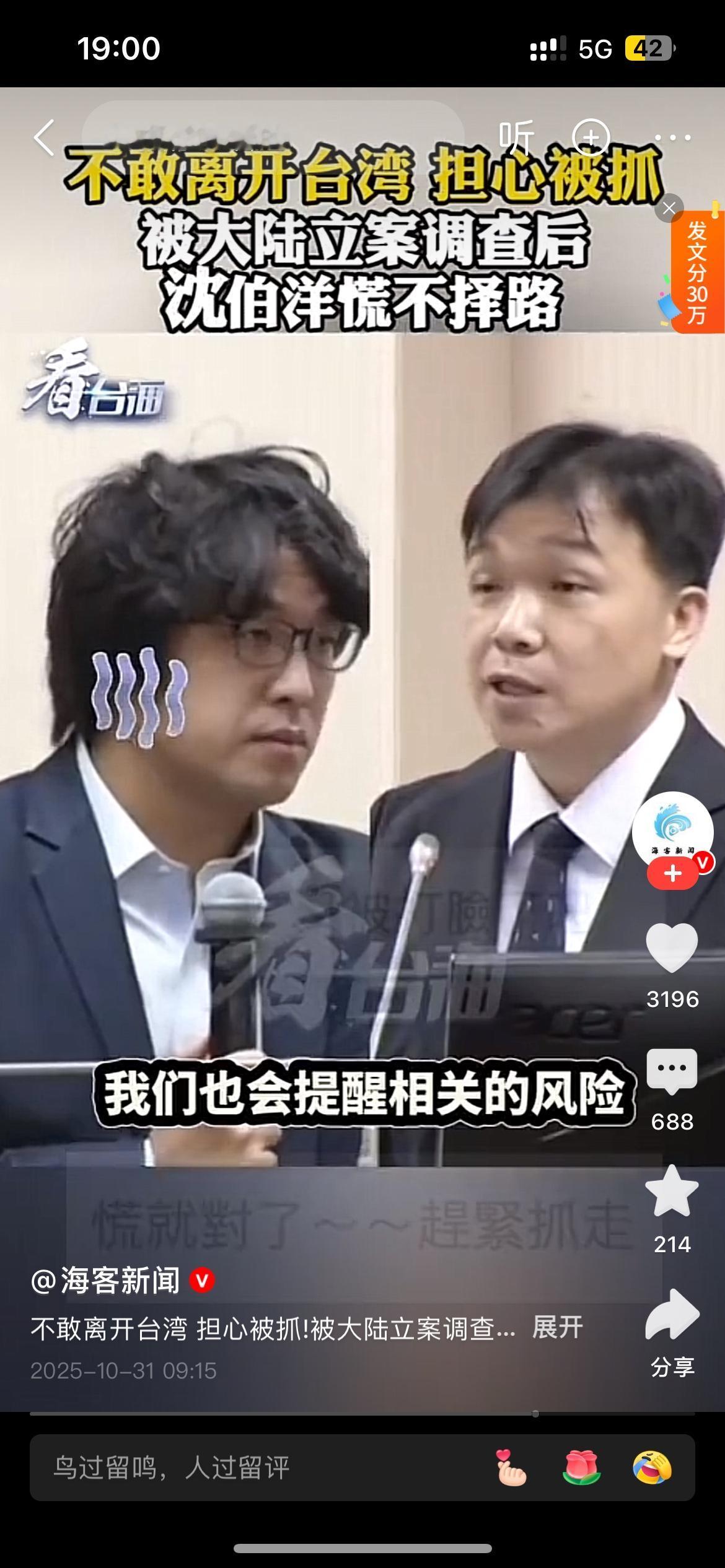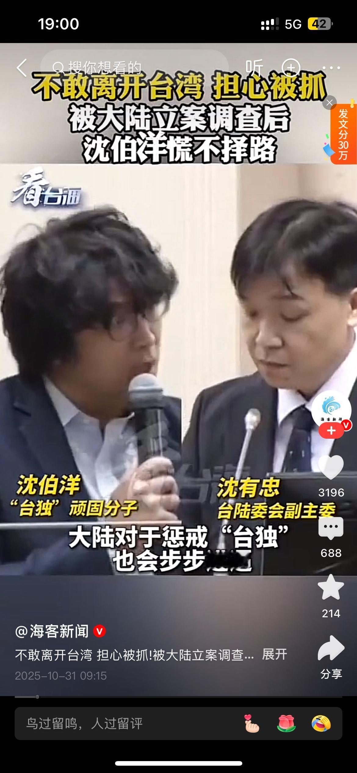 “台独”顽固分子沈伯洋慌了。在大陆对于惩戒“台独”的措施,其被大陆相关部门立案侦查,其害怕自己在别的国家被抓,而问询台湾相关部门。 然而台湾相关部门的回答,让这位“台独”顽固分子心凉半截,原来台湾相关部门仅是提醒其注意相关风险,必须要更加谨慎! 台独分子真是曾经自己跳的有多高,今天就会自己跌的有越狠!