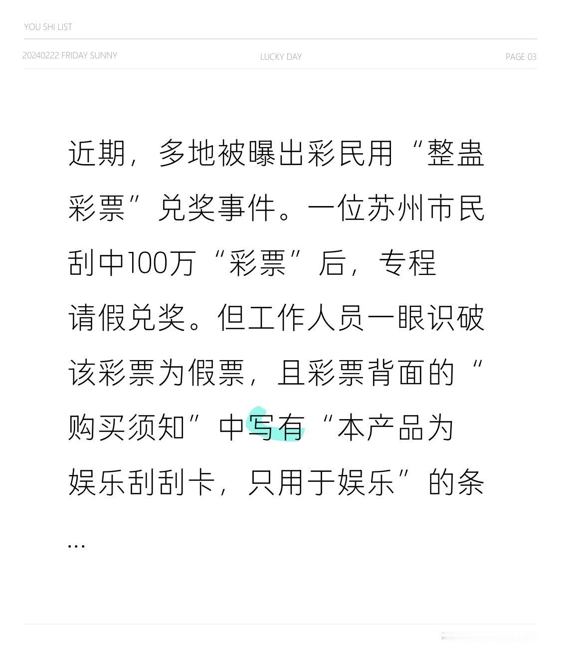近期,多地都曝出了彩民拿着“整蛊彩票”去兑奖的趣事。就说有位苏州市民,那刮彩票跟开盲盒似的,一下“刮”出了100万,兴奋得就像中了头彩的“幸运神兽”,还特意请了假去兑奖。可工作人员火眼金睛,一眼就看出这彩票是假票,再一看彩票背面“购买须知”,上面明明白白写着“本产品为娱乐刮刮卡,只用于娱乐”。