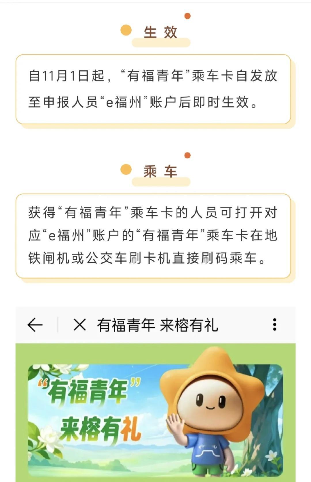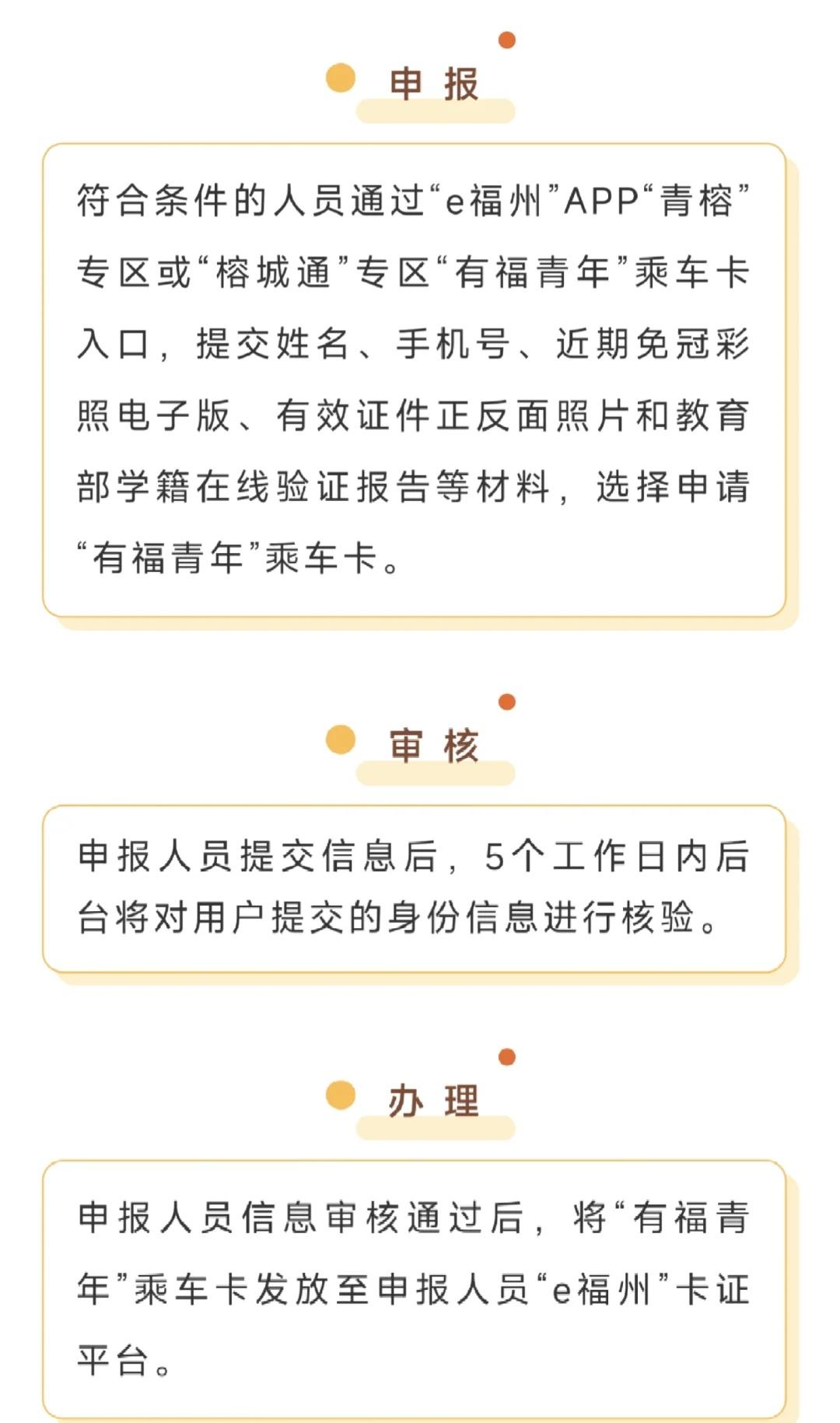 福州地铁官宣,这些人免费坐地铁 为在榕就学的大学生们量身定制的“有福青年”乘车卡将于11月1日正式启用啦!凭此卡可享受周末及节假日免费地铁、公交出行服务! 📌申领对象:在榕就学的大学生(指学籍有效期内的全日制在榕高校大学生,包含高职大专生、本科生、硕博研究生),可以申领“有福青年”乘车卡。 📌优惠期限:“有福青年”乘车卡为虚拟卡,成功办理后发放至申领人员“e福州”账户。 自生效之日起至2026年10月31日(含)期间,享受政策有效期内在校就读期间,周末和国家法定节假日全天运营时间内,刷码免费乘坐市内公交、地铁优惠。 ❗️重点:“有福青年”乘车卡仅限本人持有使用,不可转借他人或代他人刷码乘车。刷码乘车时,福州地铁有权核验是否为本人使用。针对稽查发现冒用他人乘车卡的乘客,按照《城市公共交通条例》《城市公共汽车和电车客运管理规定》等规定,按票价支付和加收票款;首次被发现违规使用的乘车卡将停用3个月,再次违规的乘车卡将永久停用。 福州 福州地铁 地铁