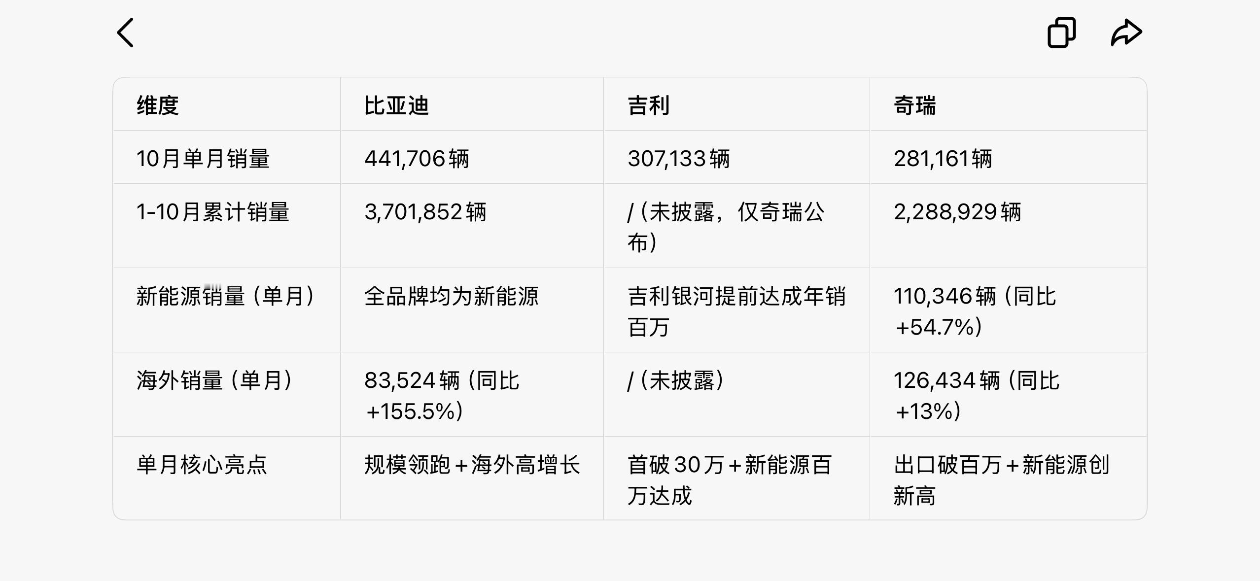 三家车企各有亮点:比亚迪规模优势显著,吉利新能源增速突出,奇瑞出口与新能源齐头并进。大v聊车