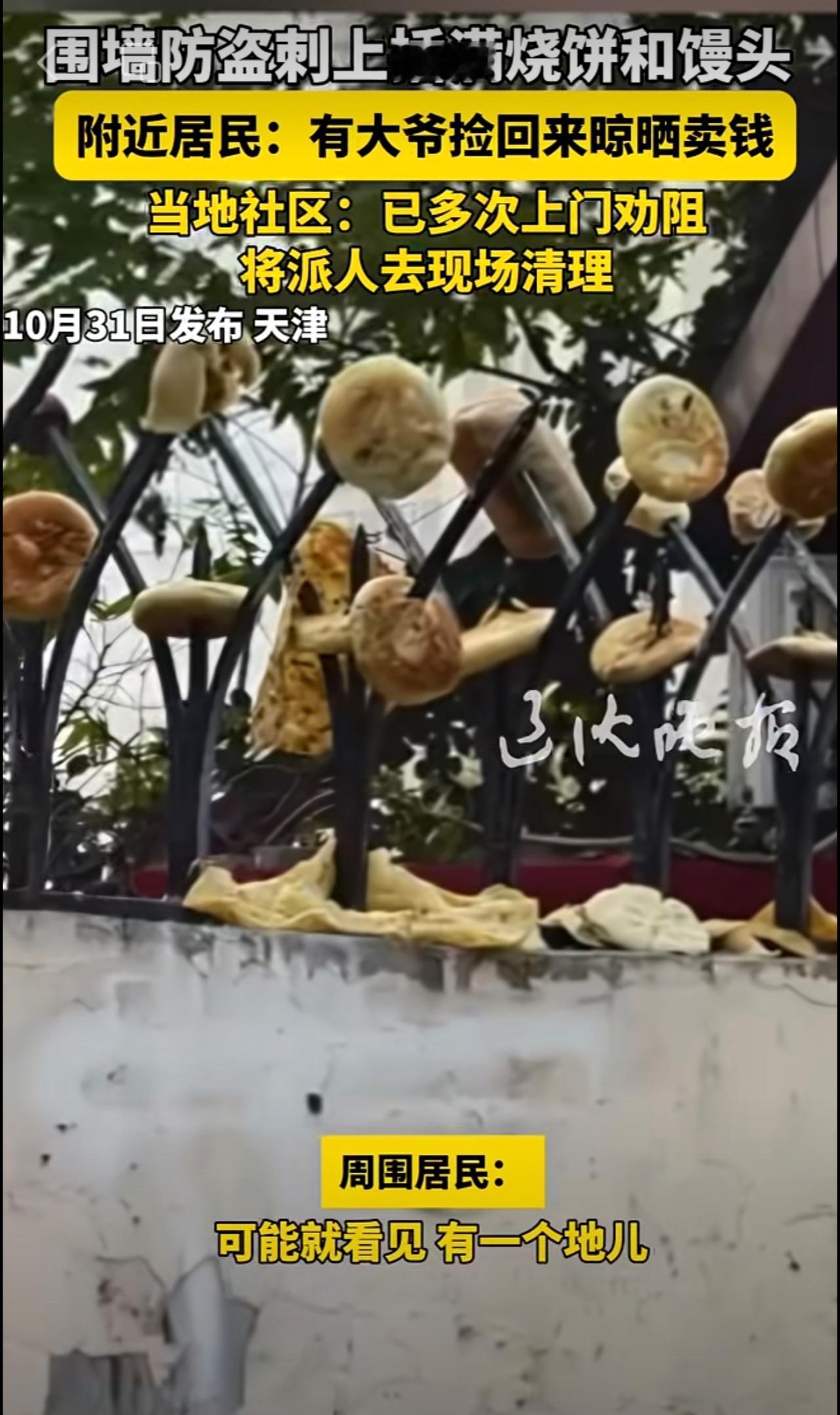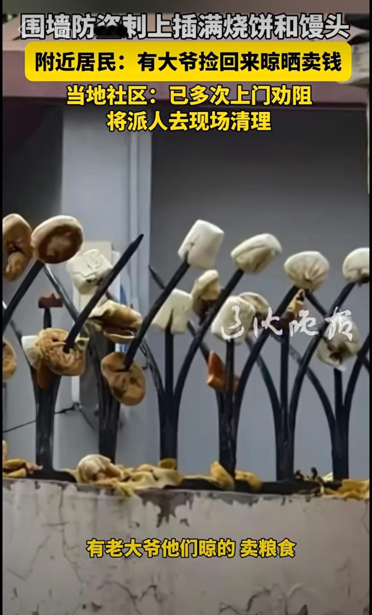 围墻防盜刺上插满烧饼和馒头 附近居民:有大爷捡回来晾晒卖钱 当地社区:已多次上门