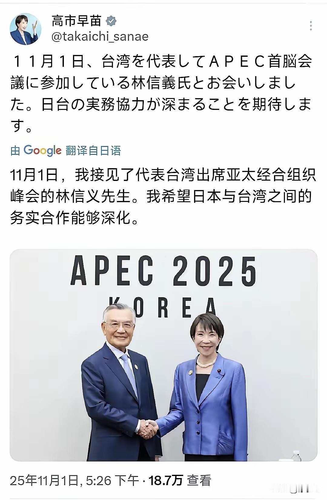 请注意,高市早苗的阴险嘴脸。 她将中国台北代表称为台湾代表; 将日本与中国台湾直接称为日本与台湾。 这种嫁接歪曲水平,跟民进党有得一比。 我们在APEC接见小日子,是先礼后兵。都知道小鬼子阴险小伎俩,此后就不必客气了。 高市早苗的言论绝非口误,而是精心设计的政治试探。这种刻意模糊一个中国原则的行为,已经触碰了中日关系的底线。根据中日联合声明等四个政治文件,日本政府明确承认台湾是中国领土不可分割的一部分。如今某些政客却玩起文字游戏,简直是把国际共识当儿戏。 看看历史就知道,这种小动作从来就不是孤例。去年日本《防卫白皮书》就曾偷偷修改台湾标注,引发中方严正抗议。这种步步为营的试探,分明是想掏空中日关系的政治基础。就像温水煮青蛙,每次只加温一度,最终却要危及两国关系根本。 台湾问题关乎中华民族的核心利益。14亿中国人民维护国家统一的意志坚如磐石。任何企图分裂中国的行径,都注定是螳臂当车。从佩洛西窜台到现在的日本政客耍花招,这些表演最终都只会让世界看清谁在破坏地区稳定。 日本某些人似乎忘了历史的教训。当年军国主义分子也是从试探开始,最终将日本拖入战争深渊。如今重温这段历史,就是要提醒某些人:在台湾问题上玩火,终将引火烧身。中国早已不是当年的中国,我们既有诚意交朋友,更有能力反制挑衅。 亚太地区不需要新的紧张源。日本政客应当明白,与其绞尽脑汁打擦边球,不如为推动区域合作做些实事。RCEP刚刚生效,中日韩自贸区谈判正在推进,这些才是造福各国人民的正途。搞政治操弄最终只会损人害己。 中国政府始终保持着战略定力。我们的应对既有原则的坚定性,也有策略的灵活性。就像下围棋,既能看到局部交锋,更注重全局大势。某些政客的小聪明,终究难撼中国维护国家主权和领土完整的钢铁意志。高市早苗 各位读者你们怎么看?欢迎在评论区讨论。