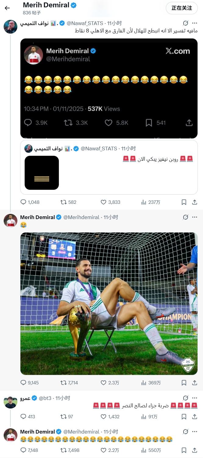 在目睹VAR最后时刻判给利雅得胜利点球后,包括效力于利雅得新月的鲁本-内维斯、马尔科姆,以及效力于吉达国民的马赫雷斯、德米拉尔均在社交媒体发出了一连串的笑哭表情。