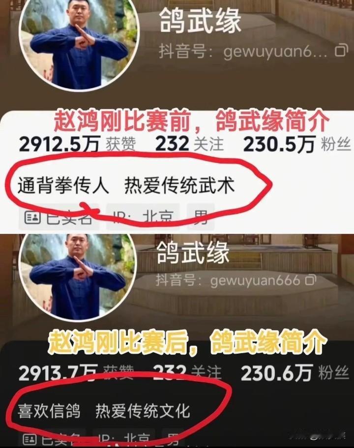 一觉醒来,“鸽武缘”的天塌了 徒弟赵鸿刚扇耳光大赛输了,网友们怀疑通臂拳不能打,居然要他下场出手给徒弟报仇。 11月1日,通臂拳传人赵鸿刚参加世界职业扇耳光大赛,最后遗憾的败给哈萨克斯坦职业拳击选手阿曼塔耶夫,眼角鼻孔出血摔倒在地上。 网友们的在评论区吵成一片,有的说是对手故意犯规才导致赵鸿刚的失败,还有人把这事上升到传武能不能打得问题,但更多的网友在评论区@赵洪刚的师傅,著名的通背拳大师“鸽武缘”,要他下场为徒弟报仇,证明传武的实力。 要说“鸽武缘”在视频里的实力的确配得上大师称号,平常拍视频都是拿西瓜、扳手这些东西练手,西瓜一掌就碎,扳手一拍就弯,引得无数网友赞叹,还有更多人慕名前往拜师学艺,这就包括赵鸿刚。 现在自己的爱徒惨败于国际擂台,被人打得鼻青脸肿满脸是血,引来网友的嘲笑。到底是徒弟学艺不精经验不足,还是传武根本不能打上不得擂台,或者是说是没有得到真传,现在“鸽武缘”也没有正面给出网友回复。 至于说是否要下场为徒弟报仇挽回面子,“鸽武缘”也只是在评论区含糊不清的回复“下次一定参赛”,至于下次到底是哪次,或者什么时间,他本人没有说明。 但是有细心的网友发现“鸽武缘”抖音的简介突然变了,从以前的“通背拳传人,热爱传统武术”,变成了现在的“喜欢信鸽,热爱传统文化”,也许他也害怕了。 看到满脸是血的徒弟神志不清的躺在擂台上,再想想那样的大巴掌呼在自己的脸上,会是什么感觉,恐怕非常痛。 再说“鸽武缘”现在也是拥有几百万粉丝的大网红了,里子面子现在都有。万一上了擂台被别人一巴掌呼倒在地,那以后在江湖上还怎么混。还是正儿八经的喜欢信鸽吧,什么通臂拳,那只是爱好。 术高莫用不懂吗?报什么仇呀,明天人家还要上班呢,早点洗洗睡吧! 大家认为“鸽武缘”会出场为徒弟找回场子吗?