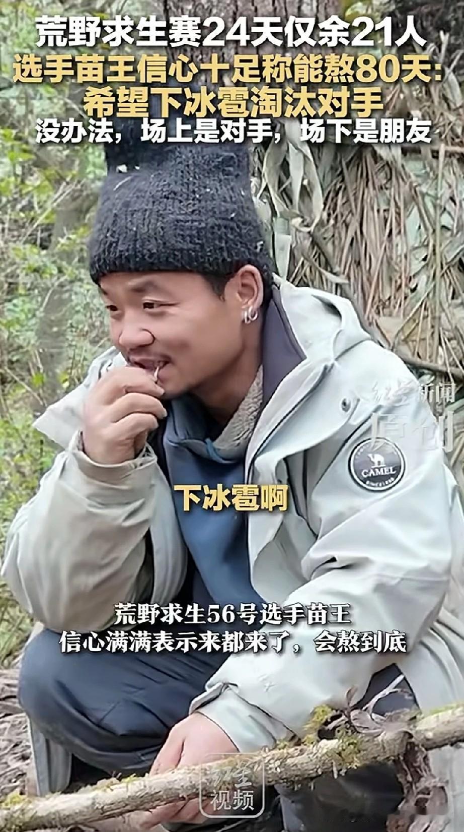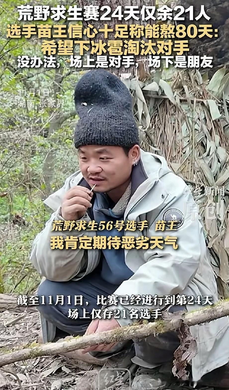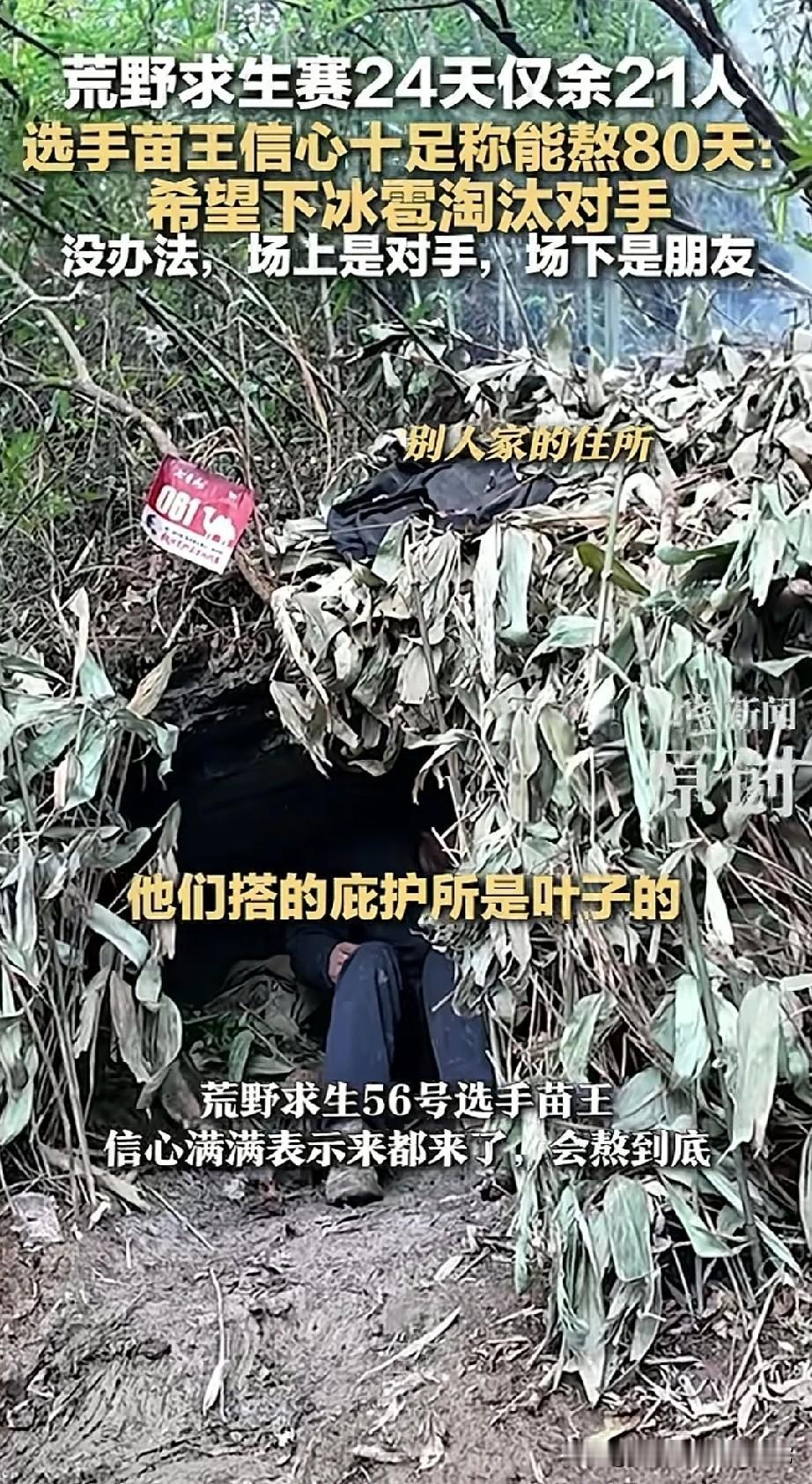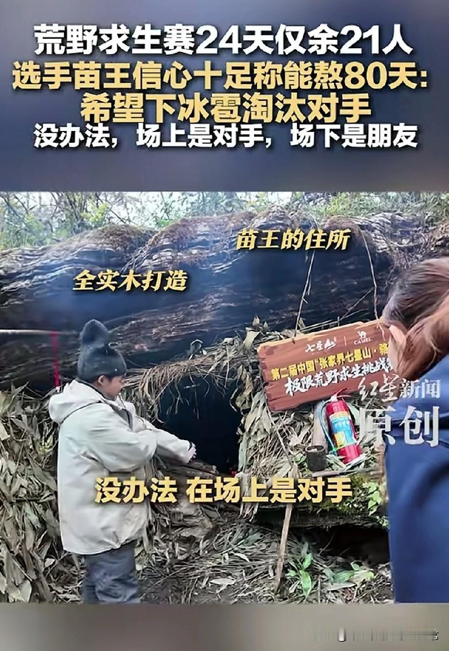 荒野求生赛杀疯了!苗王放话熬80天,盼下冰雹淘汰对手 张家界荒野求生赛绝了!24天硬生生把选手淘汰到只剩21人,56号选手苗王却狂得很,拍着胸脯说能熬80天,甚至盼着下冰雹把对手全送走。 你看他搭的实木庇护所,比别人的草窝窝结实好几倍,这求生欲直接拉满!嘴上说着“场下是朋友”,可一到场上,就盼着恶劣天气把对手全筛掉,这野心谁看了不愣? 有人骂他太狠,有人赞他真性情。但话说回来,荒野求生到底是拼生存能力,还是拼“狠”劲?