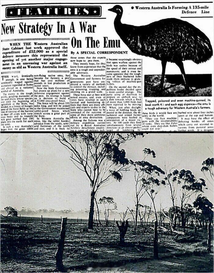 在历史上最离奇的军事行动之一中,澳大利亚军队于1932年向鸸鹋宣战。当时,大量体型庞大、不会飞的鸸鹋开始破坏西澳大利亚的庄稼,政府于是部署了配备两挺刘易斯机枪的士兵来应对这一问题。这场“鸸鹋大战”最终以彻底的失败告终。鸸鹋展现出了惊人的战术才能,它们分成许多行动迅速的小队,使得机枪几乎无法击中它们。经过几次屈辱的小规模冲突,鸸鹋一方伤亡甚微,而军队却浪费了大量弹药,最终被迫撤退。最终,鸸鹋取得了胜利,给了澳大利亚军队一次史无前例的耻辱性失败。