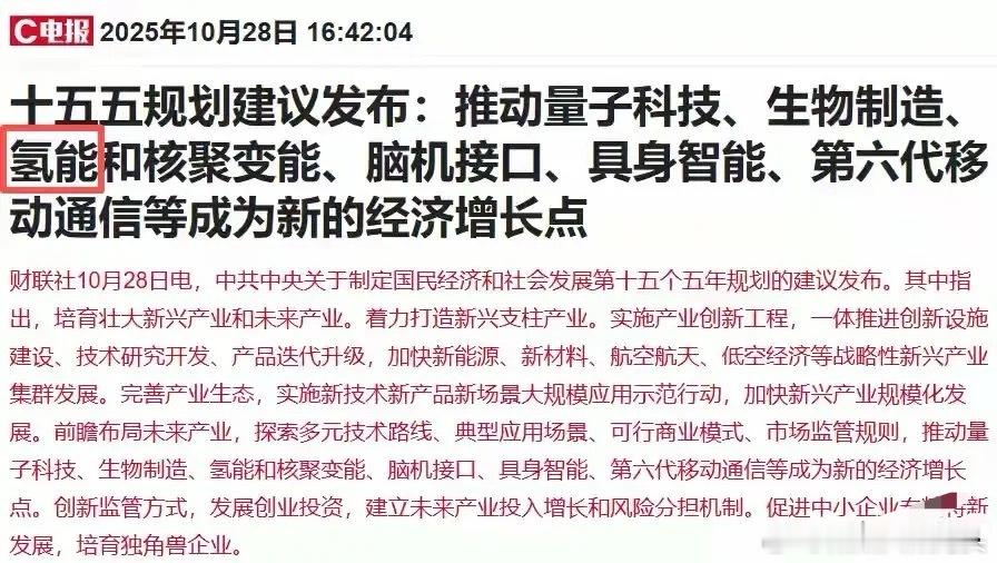 这一板块目前来说还没启动,值得潜伏“十五五”规划建议明确将氢能列为新的经济增长