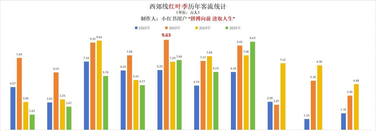 超级星期六,去香山的西郊线交出9.43万答卷 (数据来源“北京轨指中心”微信公众号,感谢原作者) 大家觉得,作为一条有轨电车线路,单日9.43万人次的运输记录,是多还是少? 作为中低运量交通工具的有轨电车,这个数据,放眼全国所有有轨电车线路,它都是很炸裂的。不过,如果跟过往数据相比,9.43万人次,并不是西郊线的极值。在昨天接近20度的气温、能见度极佳、空气质量为优、微风拂面的大好天气,叠加红叶变色率高,和周六等多重有利因素,都没能助推西郊线达到9.63万人次的单日运输极值,大概率今年是没有机会破记录了。同时,9.43万人次,也很可能成为今年西郊线单日客流的峰值。 尽管昨日客流数据并未创新高,但乘车难度却给人一种创新高的感觉。15:00,巴沟站限流围栏仍在启用,上山客流仍然能够将车厢塞得满满当当。20:30,香山站的限流围栏里,仍然有不少的乘客在“转圈圈”,这些景象都极为罕见。10:00到13:00的巴沟站,和16:30到19:30的香山站,站前广场的人,多到可以用一句小品词来形容:是左一层,右一层,左一层,右一层,最后站外还有一群人等着进站。两站最高进站等候时间均超过1小时。 路面公交同样不乐观。14:00前后,由于香山路上山路段大堵车,563路香山公园东门停车场车辆寥寥,候车乘客排起近200米的长队。傍晚时分,由于国家植物园站不封站,傍晚香山站进站公交,都是带着大客流过来的,加上香山路堵车导致公交车间隔加大,一棵松路路旁的所有公交线路均排起长队。 面对红叶节、桃花节等热门时段,西郊线面对大客流体现出的运能不足很明显。作为乘客,给大家一些实用小建议: 1、早出早归永远是对的。 2、如果1不适用,上山时段,自驾的朋友,可以把私家车停在颐和园西门停车场,从颐和园西门站进站,乘坐西郊线上山。虽然无座,但无需排队等候。 3、傍晚遇到返程高峰,步行一站地,从国家植物园站去往香山方向的站台进站,先乘车到香山站,到站后不下车再随车返回城里,又不排队又有座,是所有返程方式中,最明智的做法。香山站仅有一个站台,因此只能站前折返,到站列车不会清人。 香山