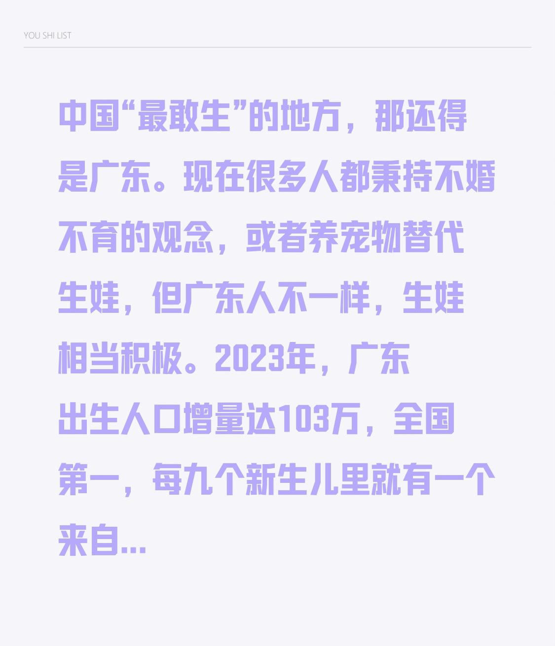 中国“最敢生”的地方,那还得是广东。现在很多人都秉持不婚不育的观念,或者养宠物替代生娃,但广东人不一样,生娃相当积极。2023年,广东出生人口增量达103万,全国第一,每九个新生儿里就有一个来自广东。 其实广东一直很能生,连续40多年出生人口超百万。在全国出生人口连续七年走低时,广东生育热情依旧高涨。曾经“最敢生”的山东,自2018年被广东反超后,这“头把交椅”广东一坐就是六年广东生小孩