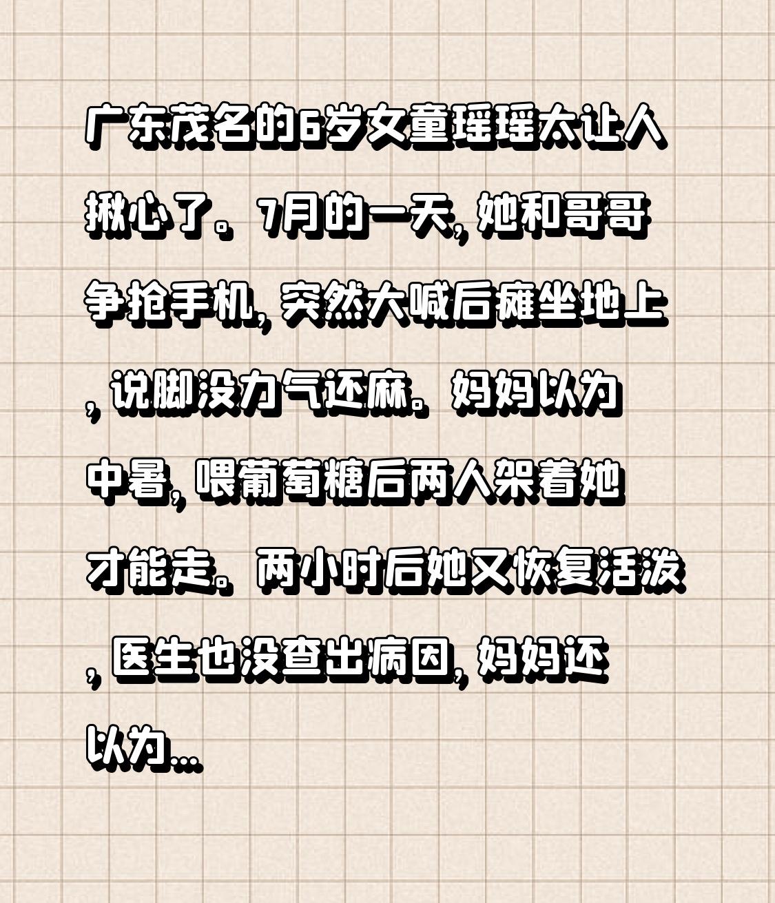 广东茂名的6岁女童瑶瑶太让人揪心了。7月的一天,她和哥哥争抢手机,突然大喊后瘫坐地上,说脚没力气还麻。妈妈以为中暑,喂葡萄糖后两人架着她才能走。两小时后她又恢复活泼,医生也没查出病因,妈妈还以为她闹脾气广东女童 瑶瑶儿子 不久后,她坐摩托时脑袋歪向一边,说“头不受控制”,下车都站不稳,被怀疑脑梗。到广东三九脑科医院检查,原来是烟雾病这个“元凶”,大脑血管像起了“烟雾”。儿童脑梗虽少见,但烟雾病引发脑梗的情况值得警惕