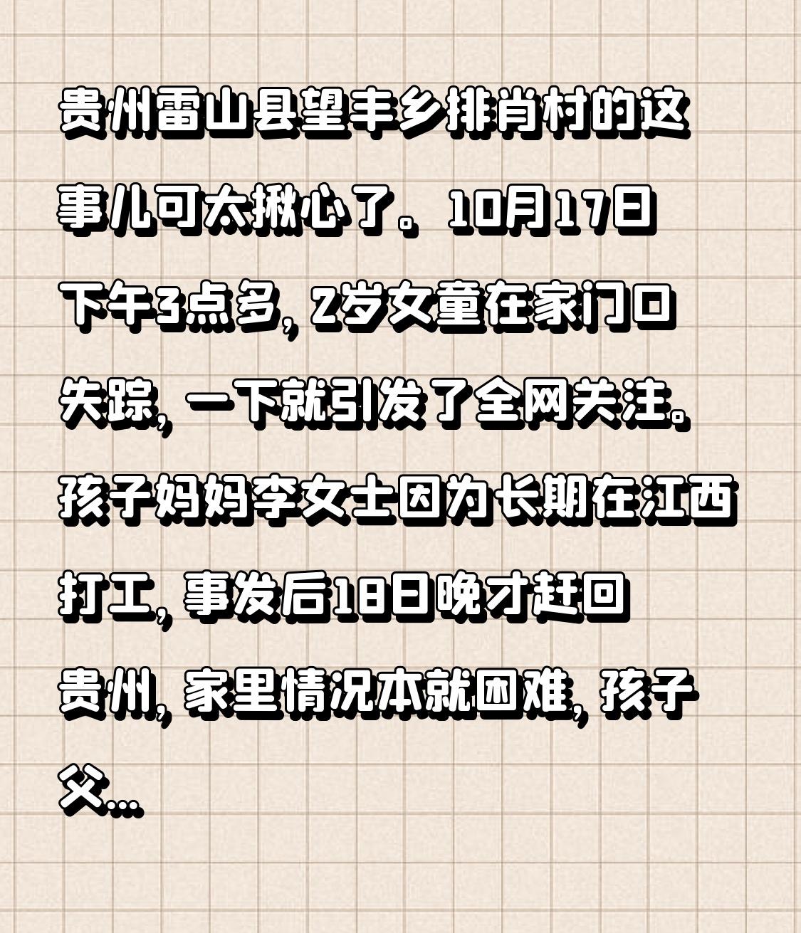 贵州雷山县望丰乡排肖村发生的这事儿着实让人揪心。10月17日下午3点多,一名2岁女童在家门口失踪,此事迅速引发了全网关注。孩子妈妈李女士长期在江西打工,事发后直到18日晚才赶回贵州。她家本就家境困难,孩子父亲还已过世。 当时,奶奶去了菜园,爷爷正在做菜,孩子便不见了踪影。关键是家里和路口的监控都坏了。五六十名村民协助警方,对监控盲区展开排查。好在19日晚6点半,孩子平安找回,并已送医检查。 2岁半失踪女童