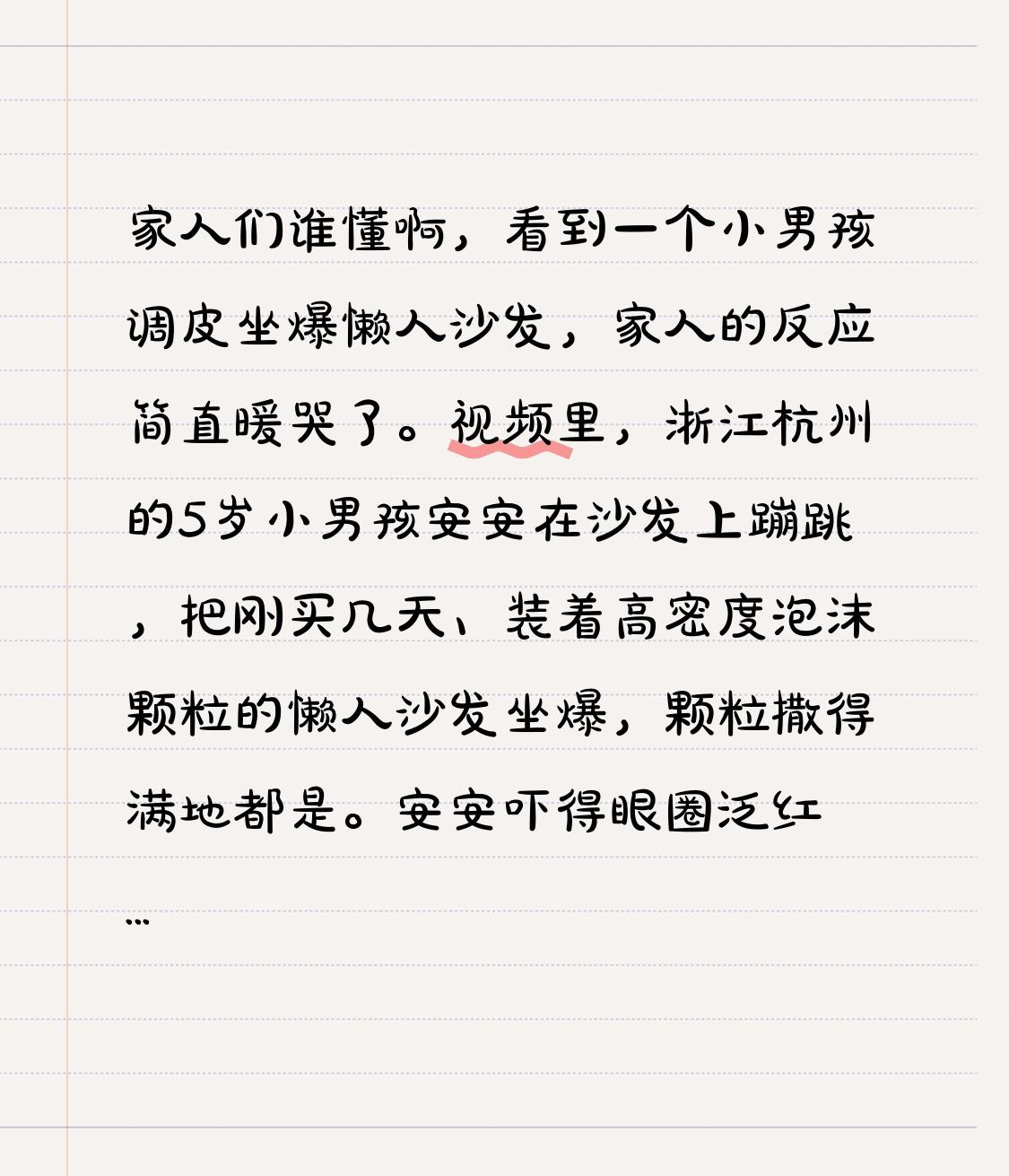 家人们谁懂啊,看到一个小男孩调皮坐爆懒人沙发,家人的反应简直暖哭了。视频里,浙江杭州的5岁小男孩安安在沙发上蹦跳,把刚买几天、装着高密度泡沫颗粒的懒人沙发坐爆,颗粒撒得满地都是。安安吓得眼圈泛红,可闻声赶来的父母和奶奶没有责备,妈妈关心他有没有扎到脚,奶奶还笑着把泡沫比作雪花。 想想自己育儿时,遇到孩子犯错,很多人可能会先批评。但这个家庭的包容,让我明白,一个家的温度就藏在面对孩子犯错的反应里沙发上的孩子