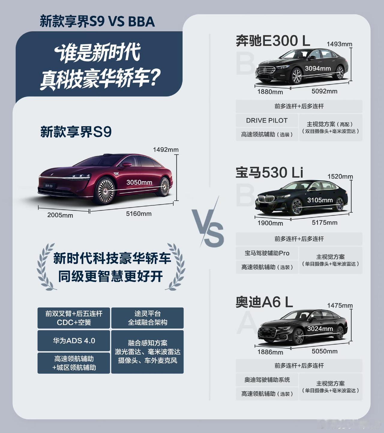 孙少军:新款享界S9的一图解析,还是做得很清楚的! 这是这款车今年第1次改款,实际上前期宣传给搞错了,它对标的车型是奔驰E、宝马5系、奥迪A6L,不少消费者认为这款车的大小不大。 轿车不像是suv车型,很容易分出大小,轿车除了紧凑型和中大型非常好区分之外,实际上其他的车辆不太好区分。 各位是怎么看的?欢迎评论区留言。